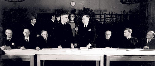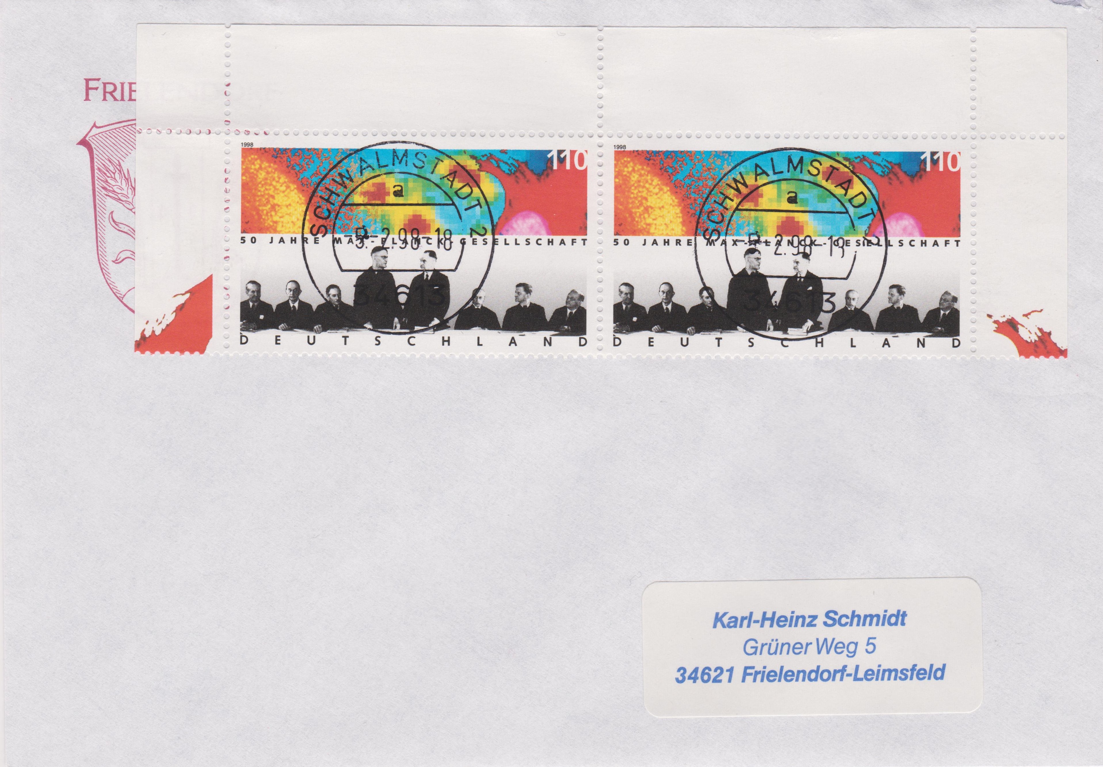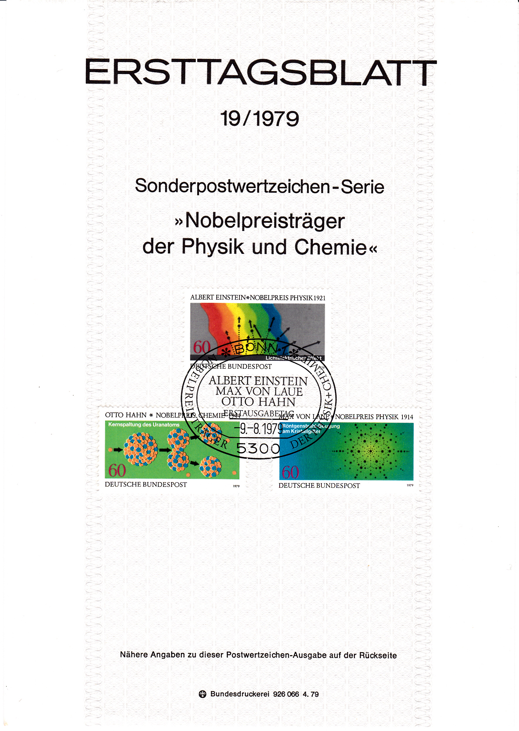 Dieses Postwertzeichen, MiNr. 1973, zeigt die Teilnehmer der Gründungssitzung der Max-Planck-Gesellschaft am 26. Februar 1948 in Göttingen: Dr. Theo Goldschmidt (Senator der MPG), Dr. Wilhelm Bötzkes (Schatzmeister der MPG),Professor Erich Regener (Vizepräsident der MPG), Adolf Grimme (Kultusminister des Landes Niedersachsen), Professor Otto Hahn (Präsident der MPG,Nobelpreisträger für Chemie des Jahres 1944), Professor Max von Laue (Nobelpreisträger für Physik des Jahres 1914), Professor Richard Kuhn (Nobelpreisträger für Chemie des Jahres 1938) und Professor Adolf Windaus (Nobelpreisträger für Chemie des Jahres 1928) (von links):