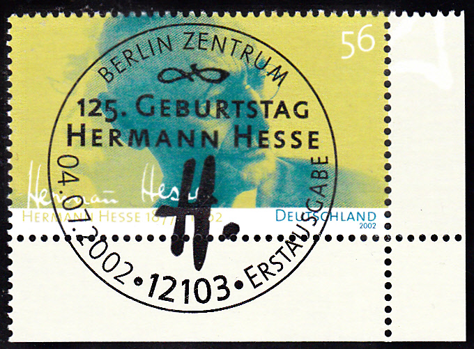 Die hier bereits gezeigte Marke der Deutschen Post AG zum 125. Geburtstag von Hermann Hesse folgt hier noch als Eckrandstück mit dem Ersttagsonderstempel Berlin.