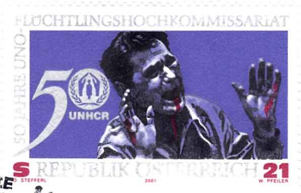 Zum Jubiläum "50 Jahre Hoher Flüchtlingskommissar der Vereinten Nationen (UNHCR)" ist in Österreich eine Marke (MiNr 2347) mit einem Flüchtling und dem UNHCR-Emblem erschienen.