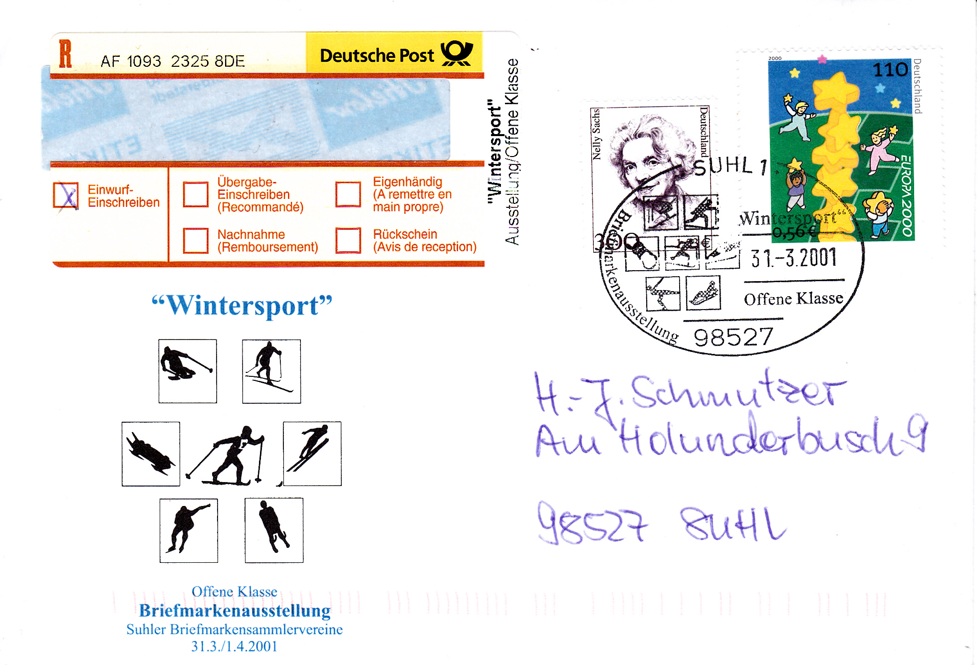 Dieser Einwurf-Einschreibebrief vom 31.3.2001 aus Suhl ist mit einer nassklebenden Europamarke 2000 der Deutschen Post (MiNr 2113) und einer Marke zu 300Pf/1,53€ (MiNr 2159) mit einem Porträt von Nelly Sachs aus der Serie "Frauen der deutschen Geschichte" portogerecht frankiert und trägt einen Sonder-R-Zettel mit dem Eindruck ""Wintersport" Ausstellung/Offene Klasse" und den dazu passenden Sonderstempel aus Suhl.