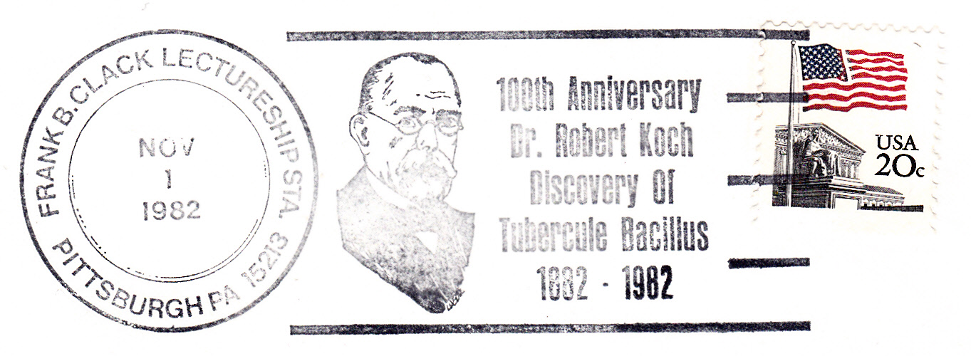 Dieser Stempel aus Pittsburgh vom 1. November 1982 zeigt Robert Koch im Bild. Anlass des Stempels ist der 100. Jahrestag der Entdeckung des Tuberkulose-Erregers.