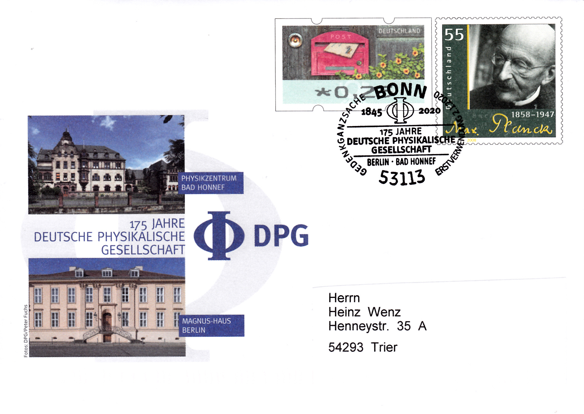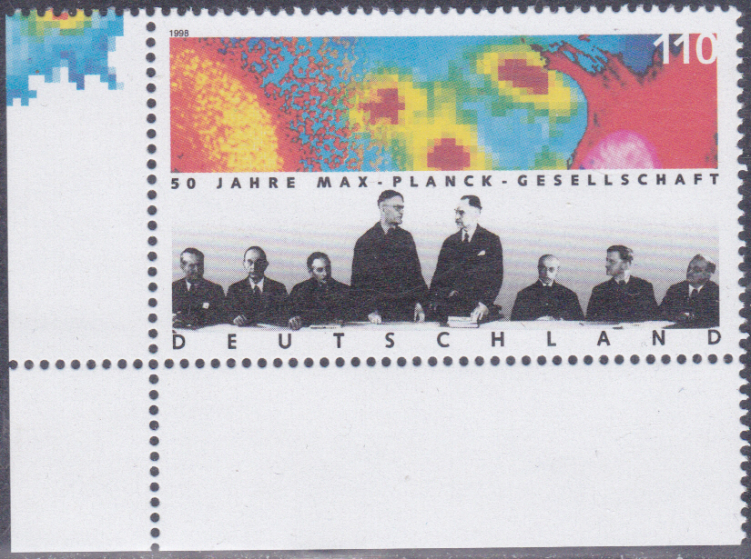 Zum Jubiläum "50 Jahre Max-Planck-Gesellschaft zur Förderung der Wissenschaften e.V." erschien bei der Deutschen Post eine Marke (MiNr 1973). Hier zeige ich ein postfrisches Exemplar vom Eckrand.