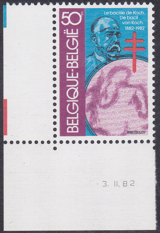 Zum 100. Jahrestag der Entdeckung des Tuberkulose-Erregers durch Robert Koch ist auch in Belgien eine Marke (MiNr 2090) mit einer Abbildung von Robert Koch und dem TBC-Erreger unter einem Mikroskop erschienen. Hier zeige ich eine Marke vom linken unteren Bogenrand mit Druckdatum.