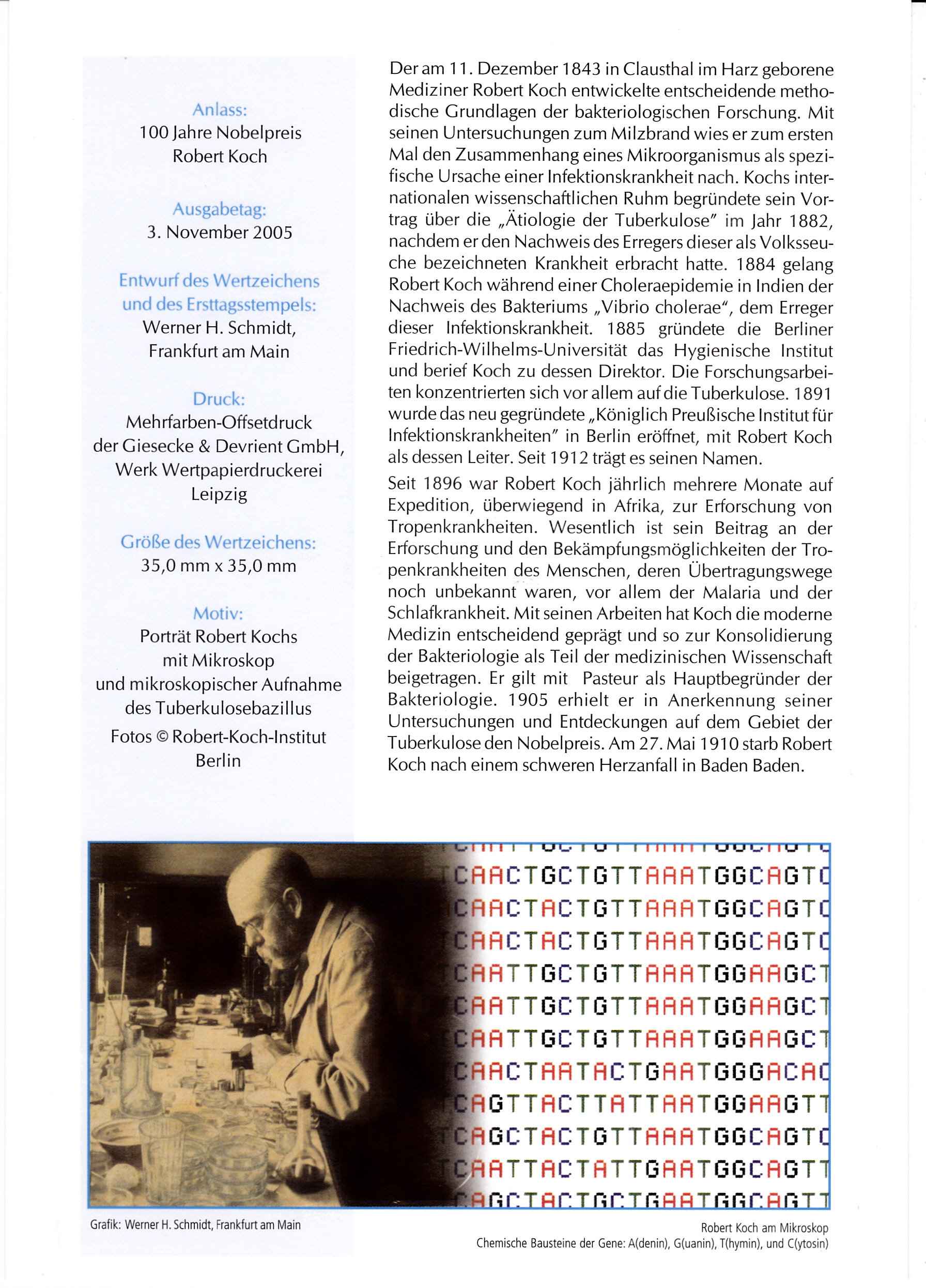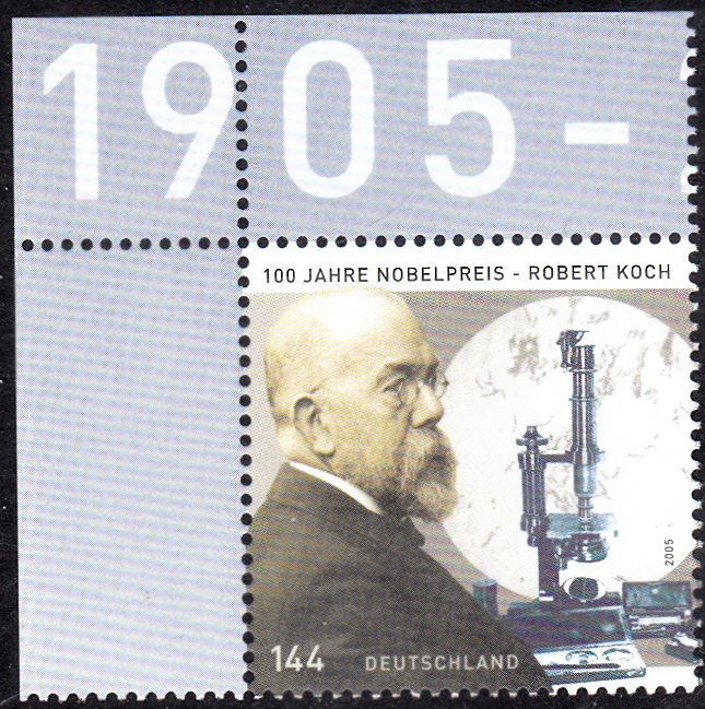 Zum 100. Jahrestag der Verleihung des Nobelpreises an Robert Koch ist bei der Deutschen Post diese Sondermarke (MiNr 2496) mit einem Porträt von Robert Koch und einem Mikroskop.