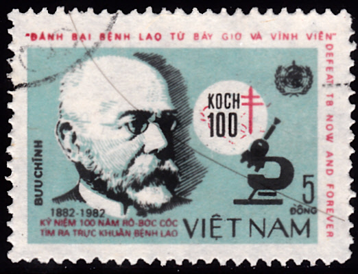 Eine Marke aus Vietnam zum 100. Jahrestag der Entdeckung des Tuberkulose-Erregers durch Robert Koch zeigtb ein Porträt von Robert Koch und ein Mikroskop.