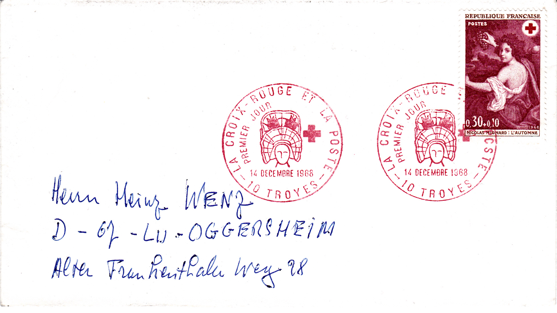 Marke aus Frankreich (MiNr 1648) aus der jährlichen Ausgabe "Rotes Kreuz" zu 0,30+0,10F mit der Abbildung des Gemäldes "L´Automne" (Der Herbst) von Werke von Nicolas Mignard (1606-1668), Maler und Graveur auf einem Brief mit Ersttagstempel aus Troyes.