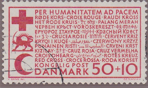In Dänemark erscheinen regelmäßig Zuschlagsmarken zu Gunsten des Roten Kreuzes. Hier eine Ausgabe aus dem Jahre 1966 mit den Emblemen des Roten Kreuzes und dem Text „Rotes Kreuz“ in verschiedenen Sprachen.