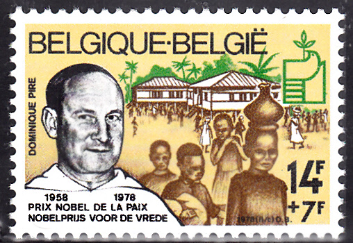 Zum 20. Jahrestag des Friedensnobelpreises für Pater Pire erschien in Belgien diese Sondermarke (MiNr 1972).