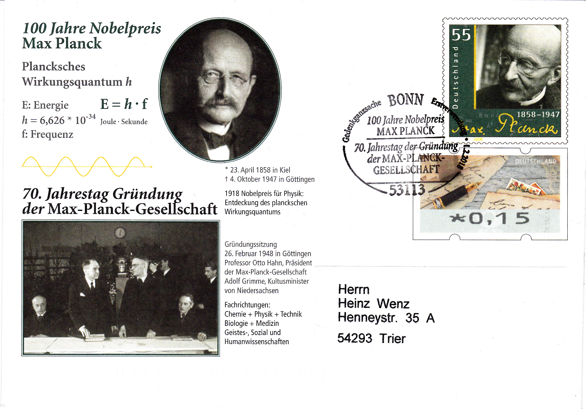 Zum Jubiläum "100 Jahre Nobelpreis für Max Planck" ist ein Ganzsachenumschlag bei der Deutschen Post mit einem Wertstempel der zuvor gezeigten Marke zu seinem 150. Geburtstag erschienen.