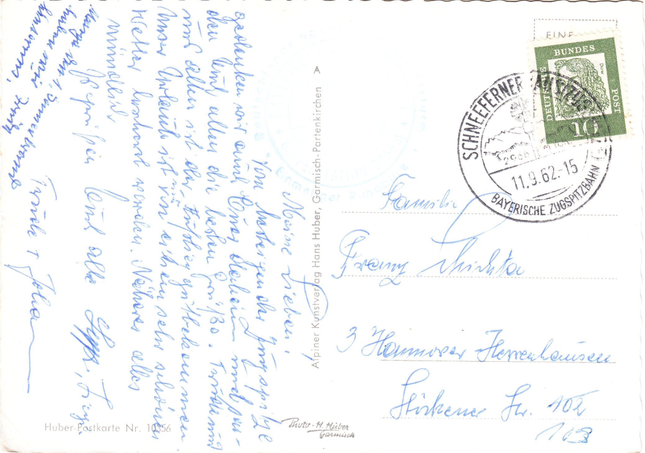 Hier eine auf dem Zugspitzgipfel aufgegebene Ansichtskarte, die Frankatur wurde mit einem thematisch passenden Handwerbestempel entwertet: