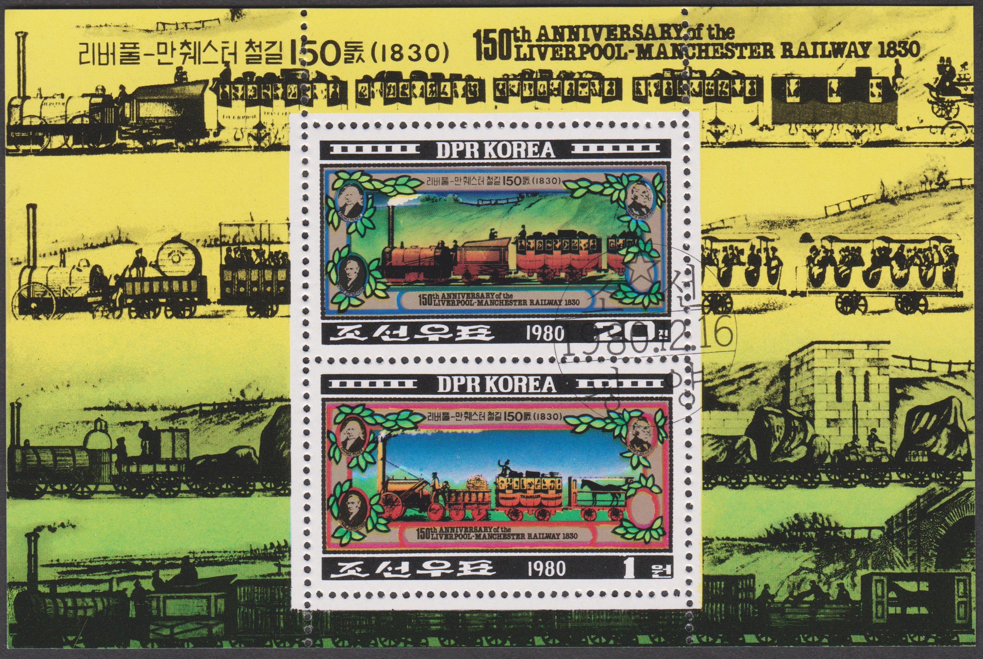 Nordkorea MiNr. 2065 erschien am 16.12.1980 aus Anlaß 150 Jahre Eisenbahnverbindung Liverpool-Manchester.