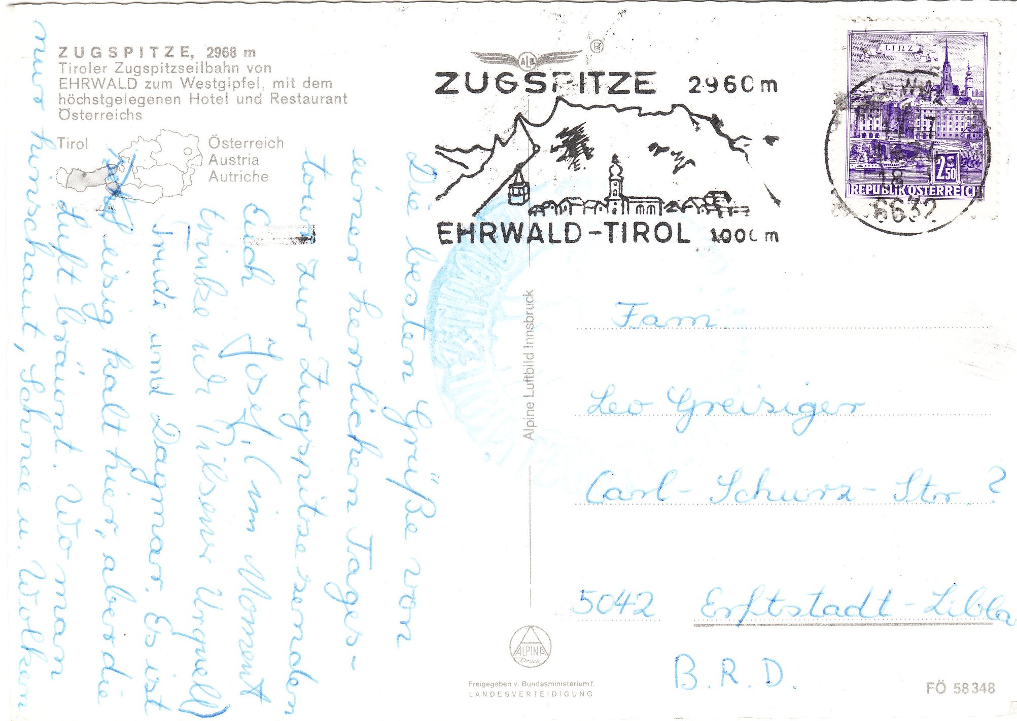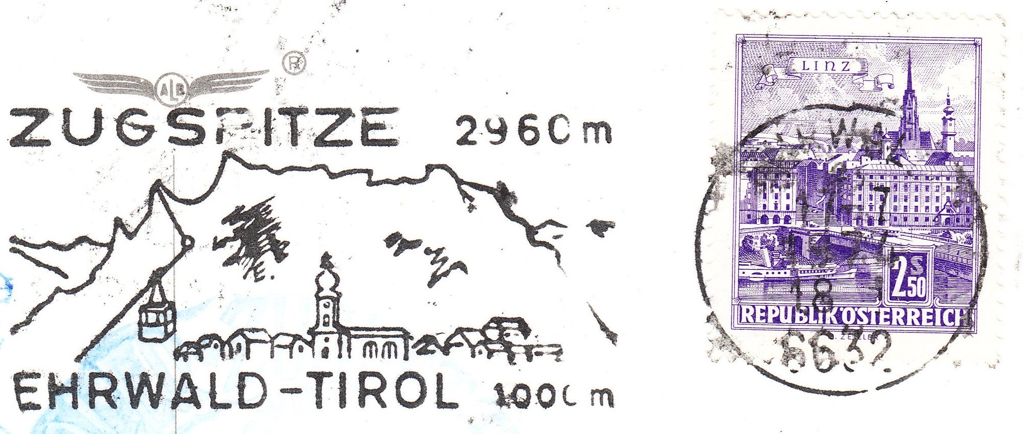 Der Werbeeinsatz dieses Maschinenstempels aus Ehrwald zeigt uns eine Gondel dieser berühmten Seilbahn:
