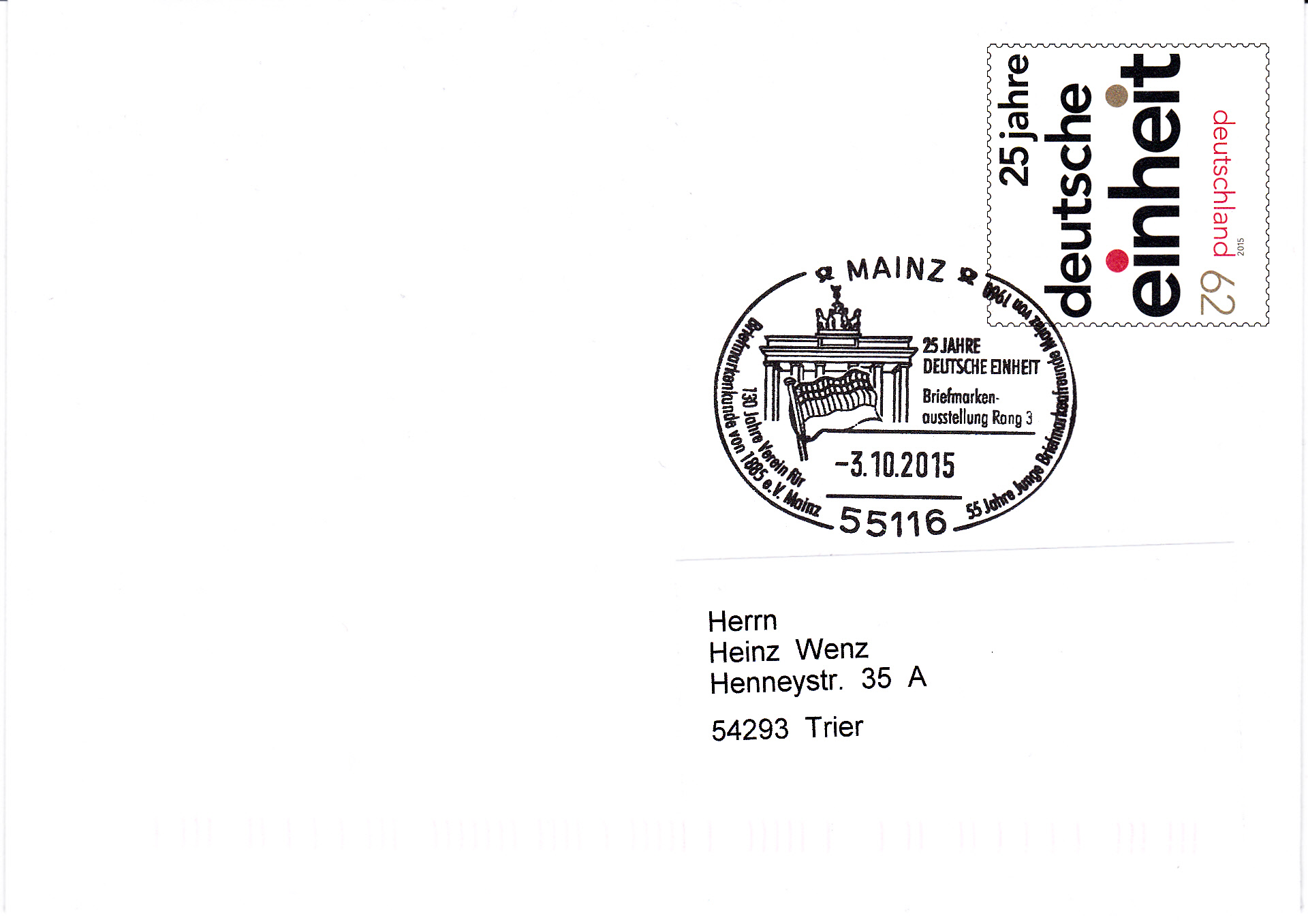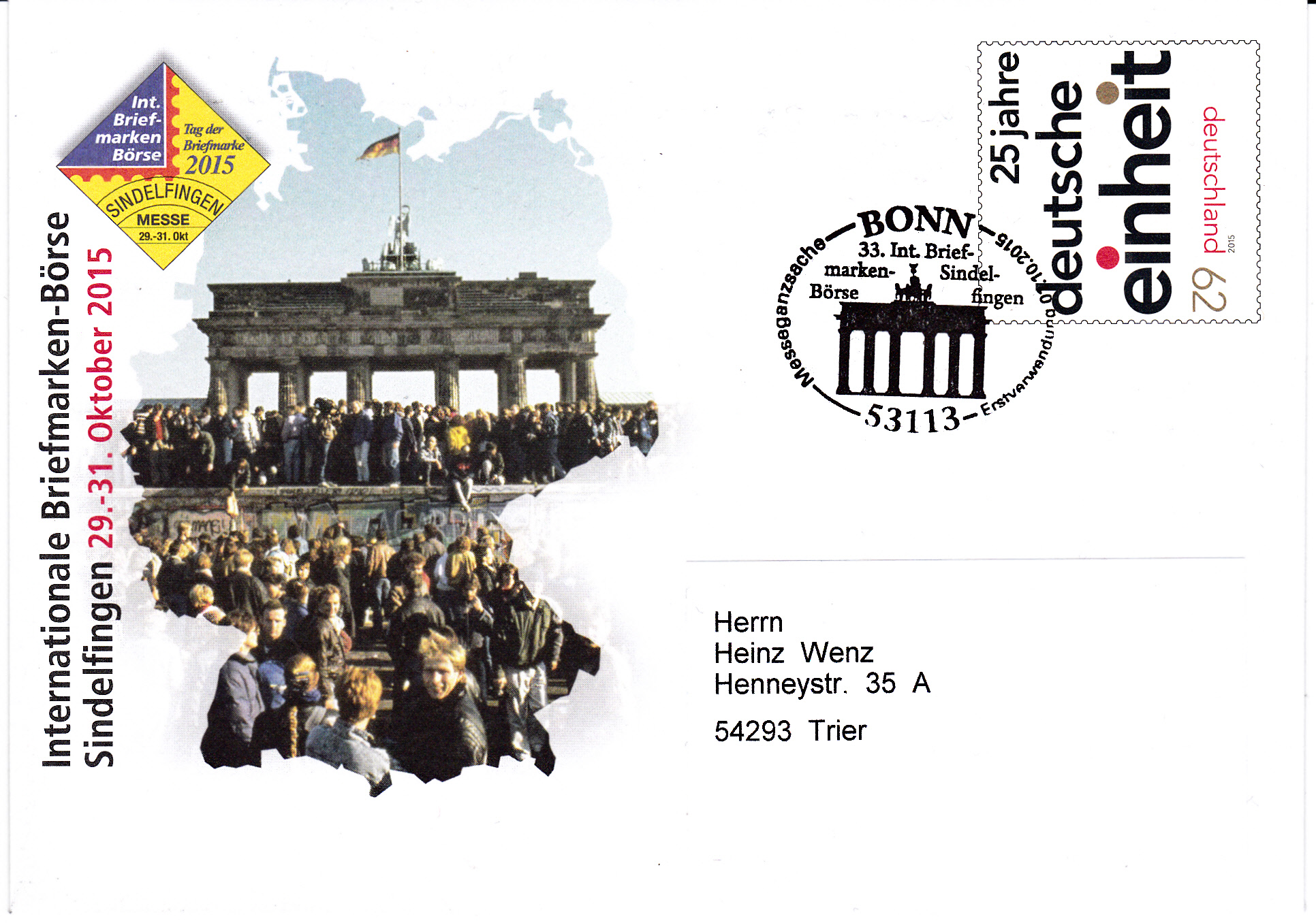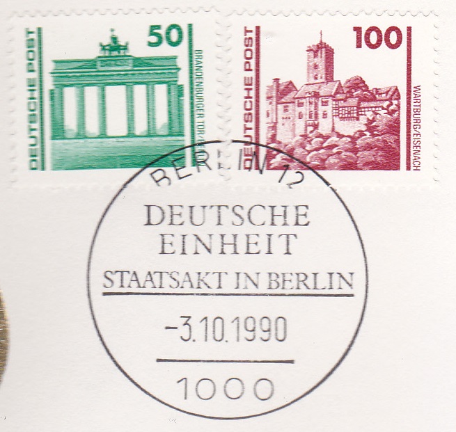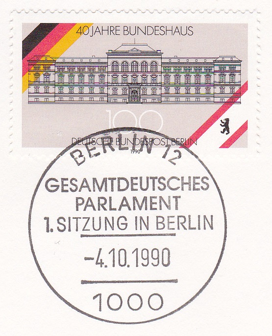 Am ersten Tag nach der Deutschen Einheit und den dazugehörigen Feierlichkeiten trafen sich die Politiker zur 1. Sitzung des neuen gesamtdeutschen Parlaments im Berliner Reichstag. An diese historische Ereignis erinnert dieser philatelistische Beleg: