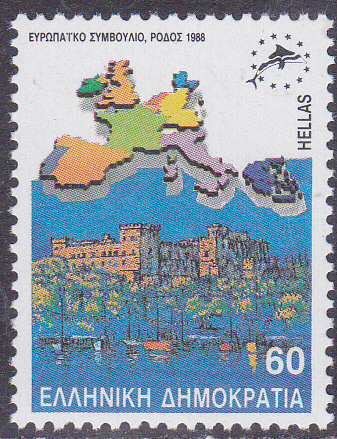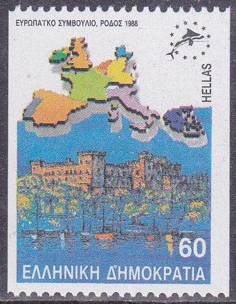 Zur Konferenz der Ministerpräsidenten der Europäischen Gemeinschaft 1988 auf Rhodos ist in Griechenlande diese Marke (MiNr 1715 A) mit einer Landkarte der EG und der Johanniterburg auf Rhodos erschienen.