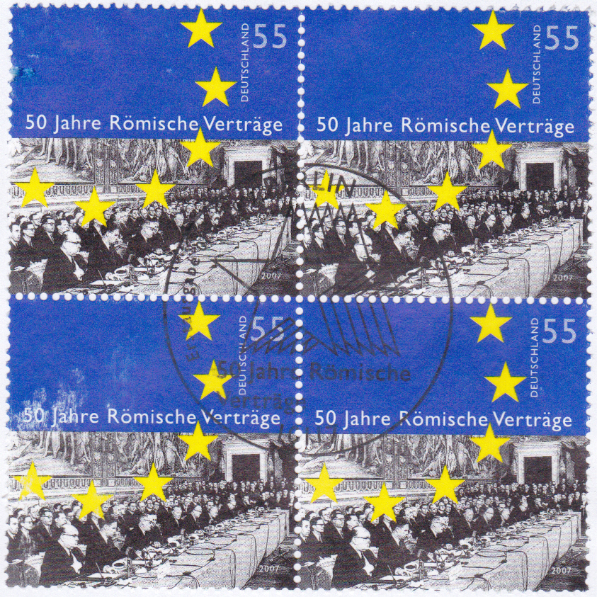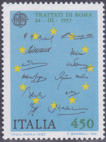 Eine Europamarke 1982 aus Italien (MiNr 1798) zum Gemeinschaftsthema "Historische Ereignisse" mit einer Abbildung zur Unterzeichnung der Römischen Verträge zeigt die Europaflagge mit Unterschriften.