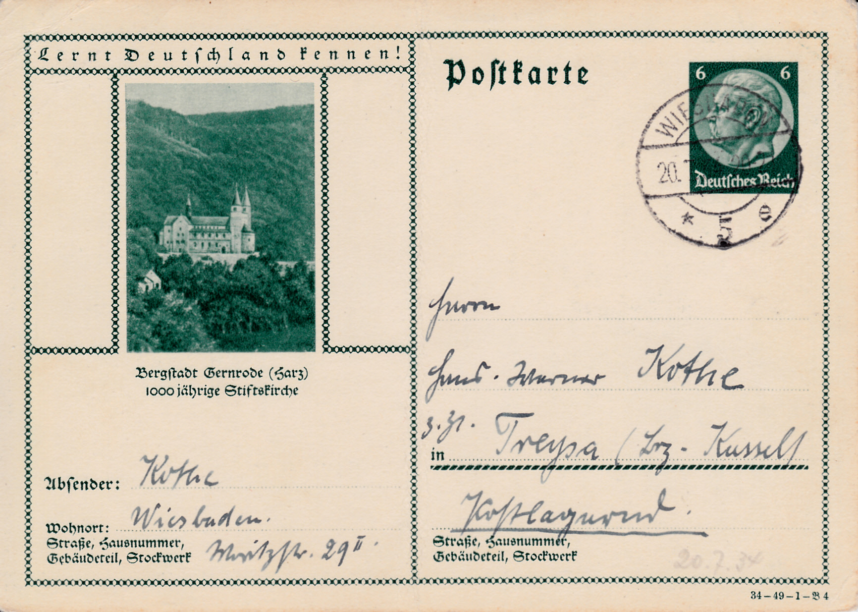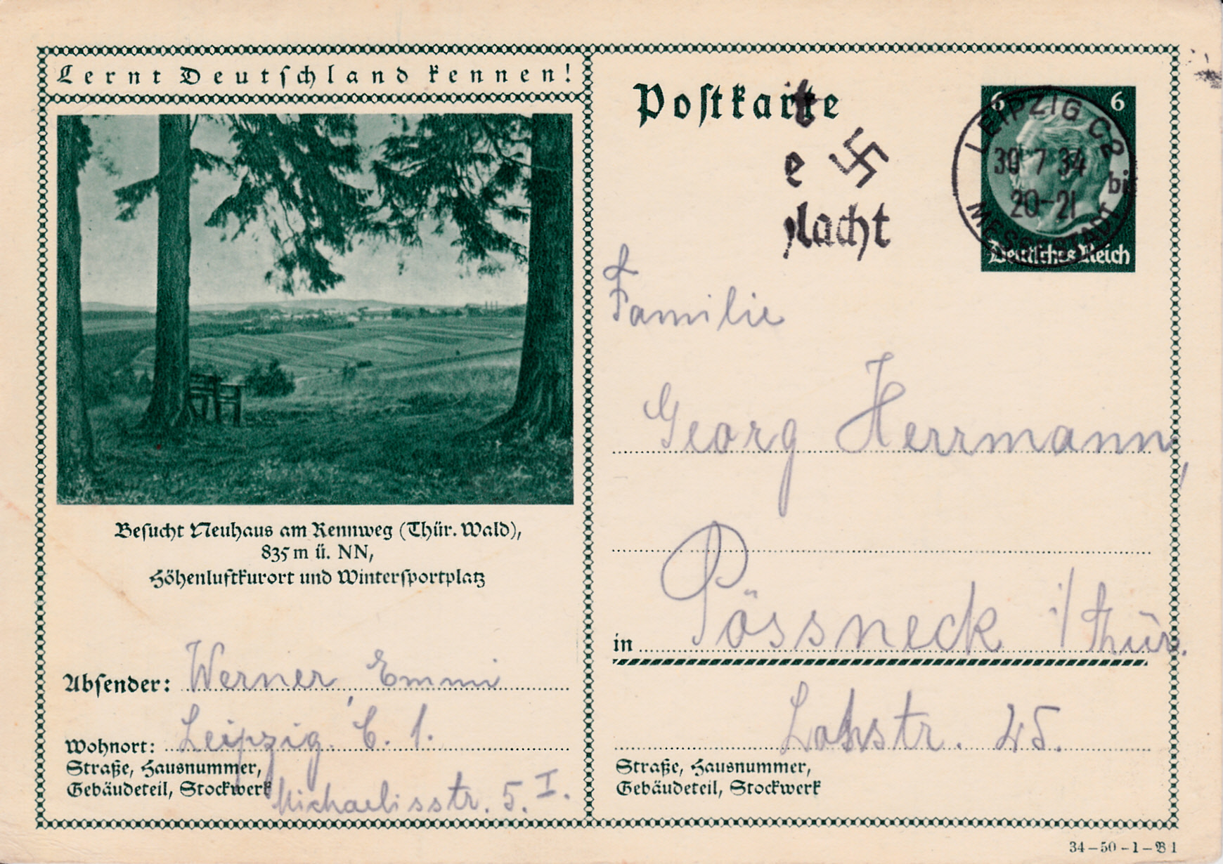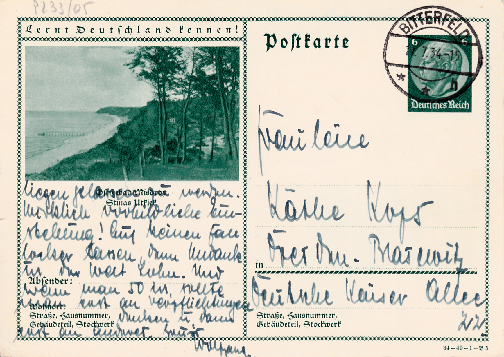 Die Bildpostkartenserie 1934 (MiNr P 233) mit dem Wertstempel "Hindenburg" umfasst insgesamt 36 verschiedene Bilder. Die Karten unterscheiden sich von den vorhergehenden Ausgaben durch einen Druckvermerk rechts unten auf der Karte. Der Druckvermerk "34-49-1-B1" bedeutet: Ausgabejahr: 1934 - Serie: 49 - Druckplkatt: 1 - Bild 1.