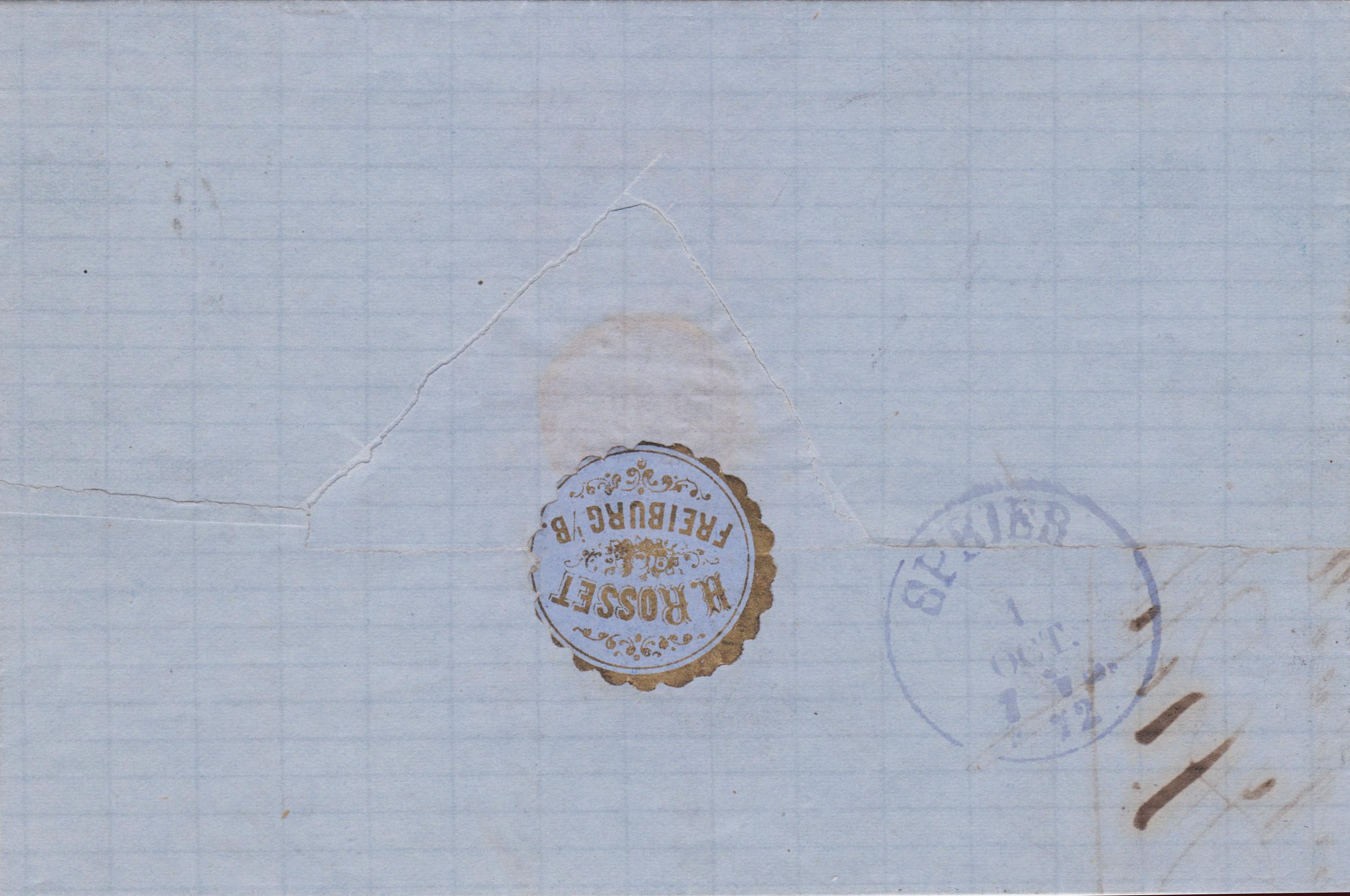 Rückseitig wurde als Ankunftstempel am 01.10.1872 der lediglich in den Jahren 1872 sowie 1873 eingesetzte Kreisstempel "SPEIER" abgeschlagen: