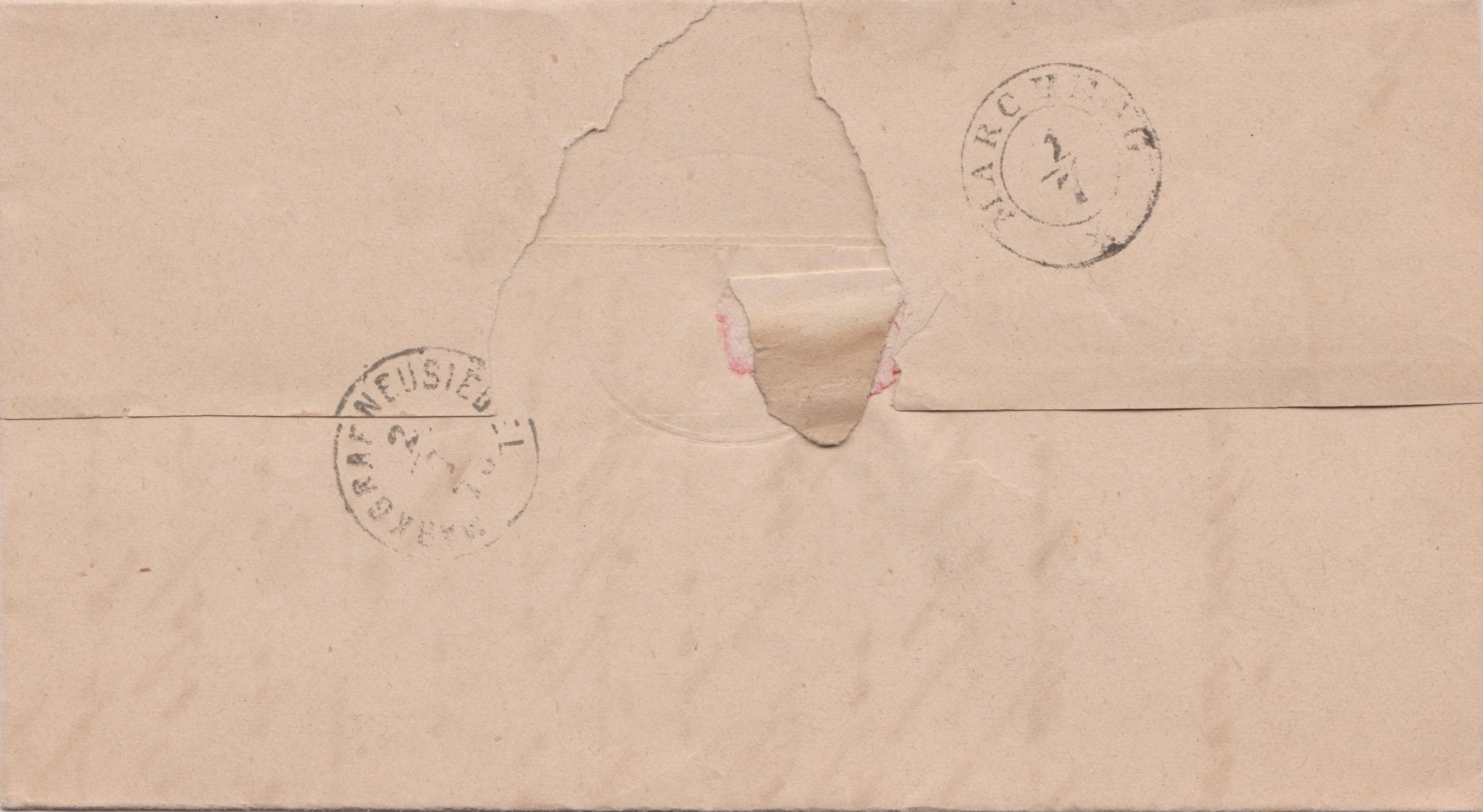 Laut rückseitigen Tagesstempeln lief dieser Beleg am 01.07.1875 über "MARCHEGG" und kam am 02.07.1875 in "MARKGRAFNEUSIEDEL" an: