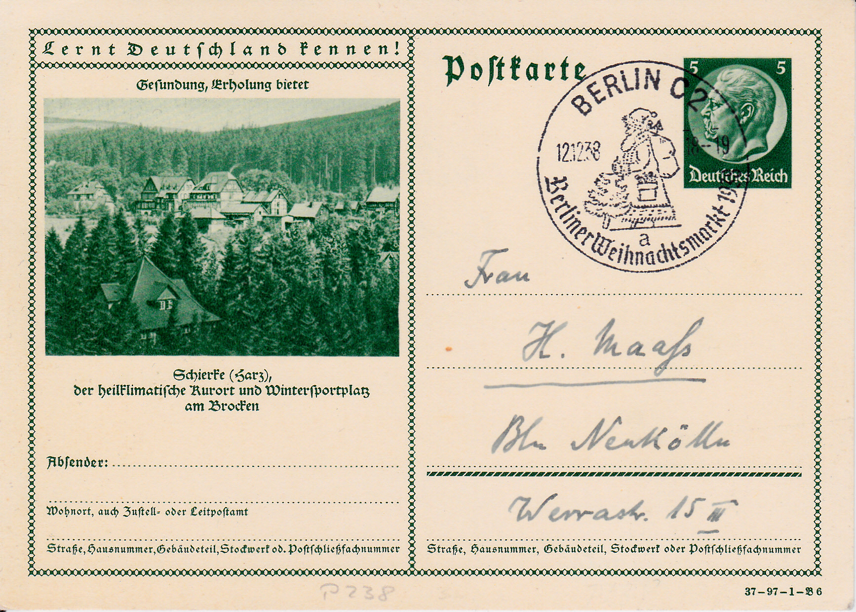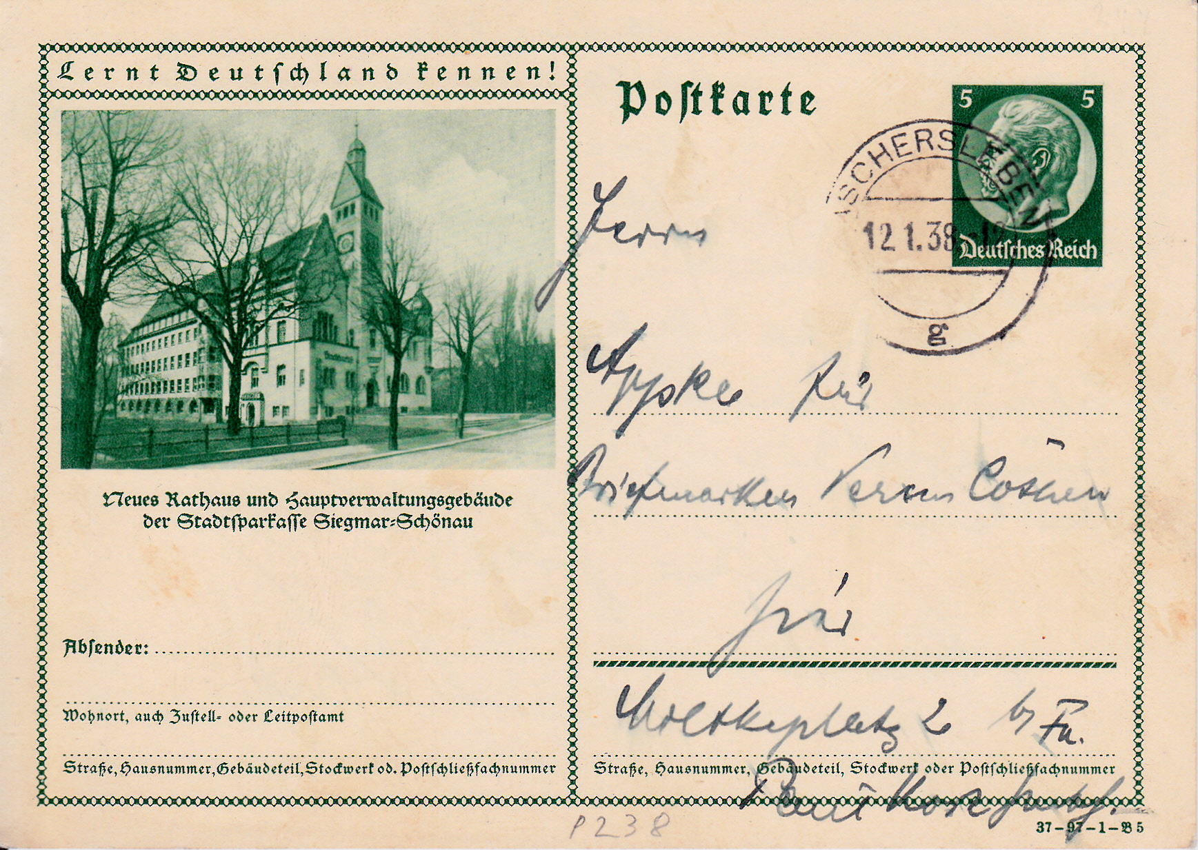 Die Bildpostkarten MiNr P 238 mit dem Wertstempel 5Pf "Hindenburg" in grün sind 1937 erschienen. Sie waren für den Ortsverkehr vorgesehen. Sie haben alle einen Druckvermerk am rechten unteren Kartenrand. Es gibt insgesamt nur 9 verschiedene Druckvermerke (Ausgabejahr-Seriennummer-Druckplattennummer-Bildnummer).