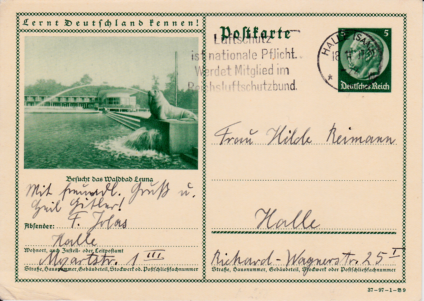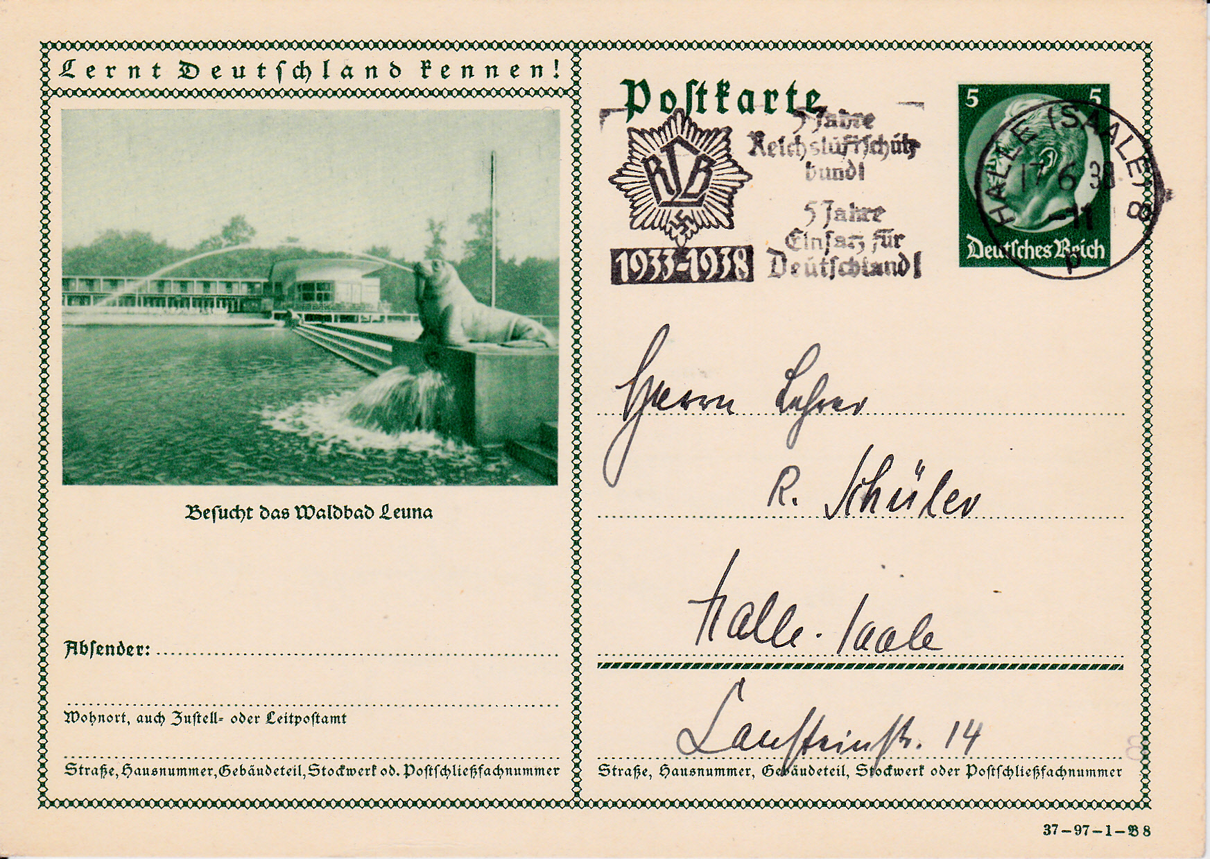 Auf dieser Karte sehen wir den Marktplatz von Leipzig während der Messe. Sie wirbt für die Leipziger Messe 1937. Die Karte wurde ohne zusätzliche Frankatur Köln nach Eisenberg (Thüringen) verschickt und auch nicht mit Nachporto belegt.
