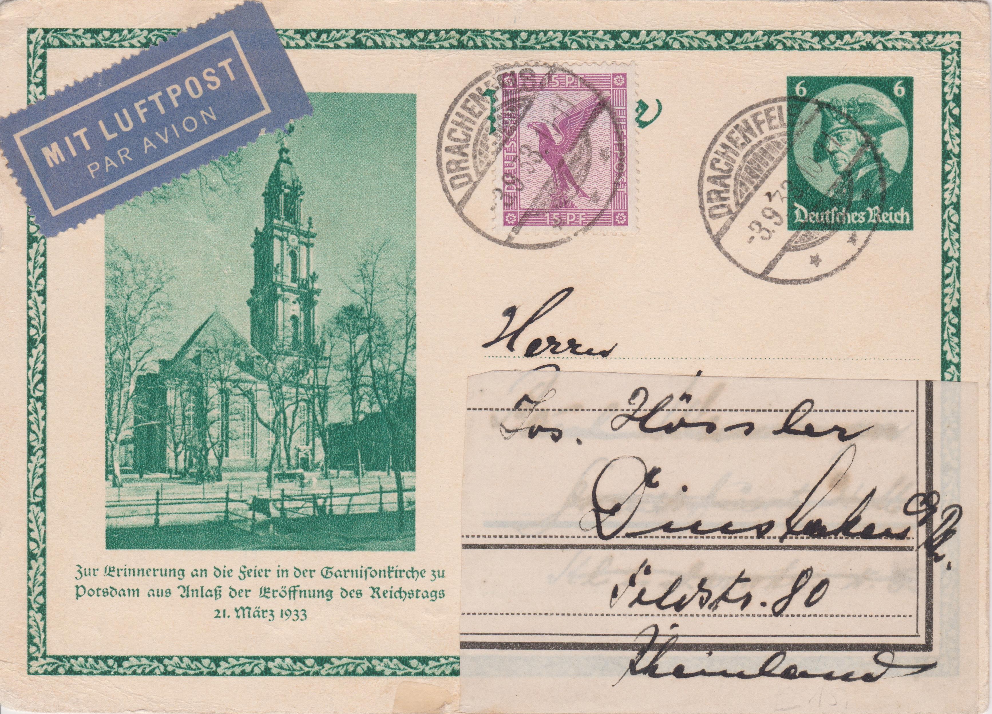 Diese Ganzsache wurde am 03.09.1933 in DRACHENFELS als Postkarte im Fernverkehr nach Dinslaken, Porto 6 Pf, per Luftpost, zufrankiertes Porto 15 Pf, aufgegeben: