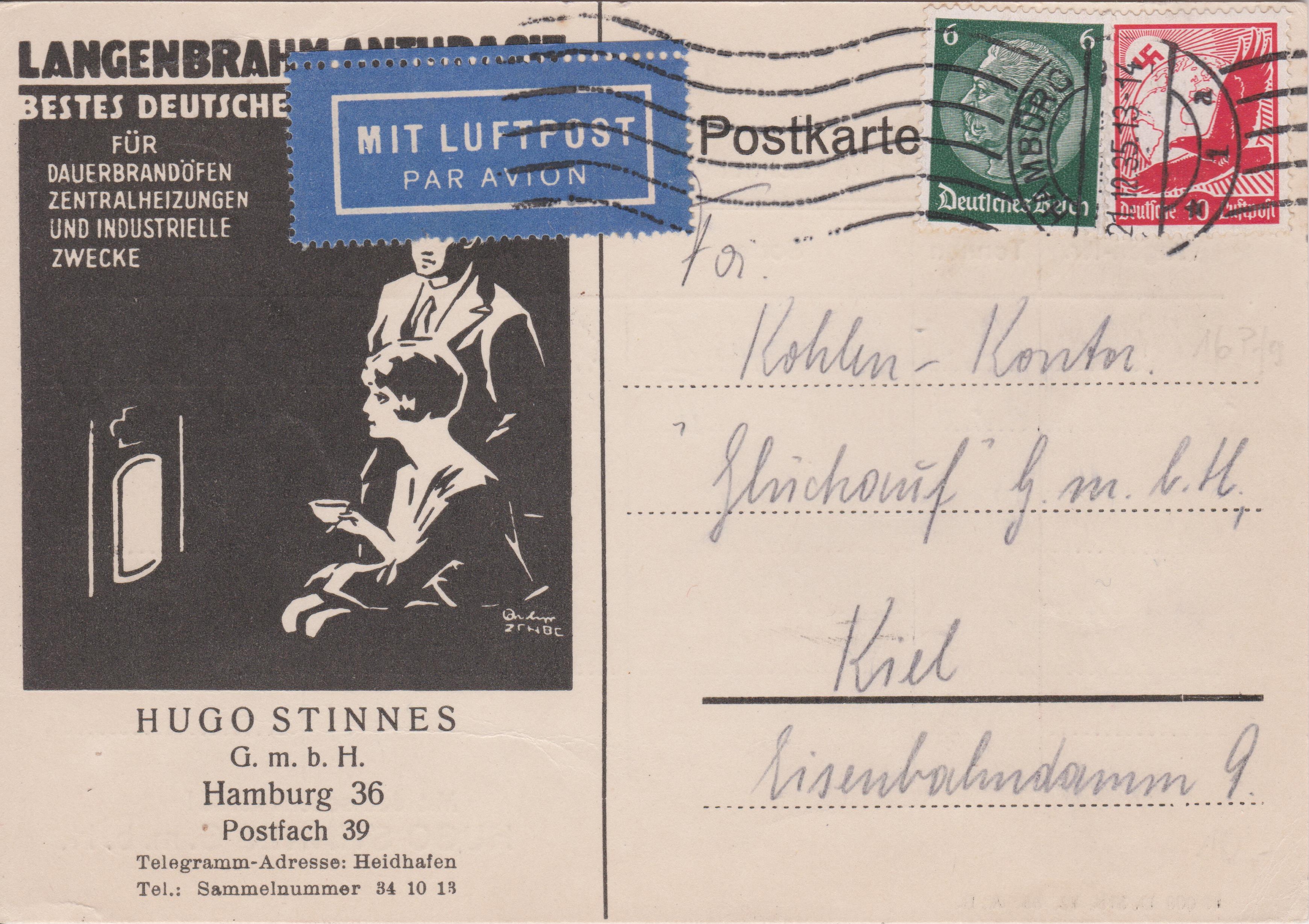 Postkarte im Fernverkehr von Hamburg nach Kiel, aufgegeben am 21.12.1935, Portostufe 6 Pf plus Luftpostporto 10 Pf: