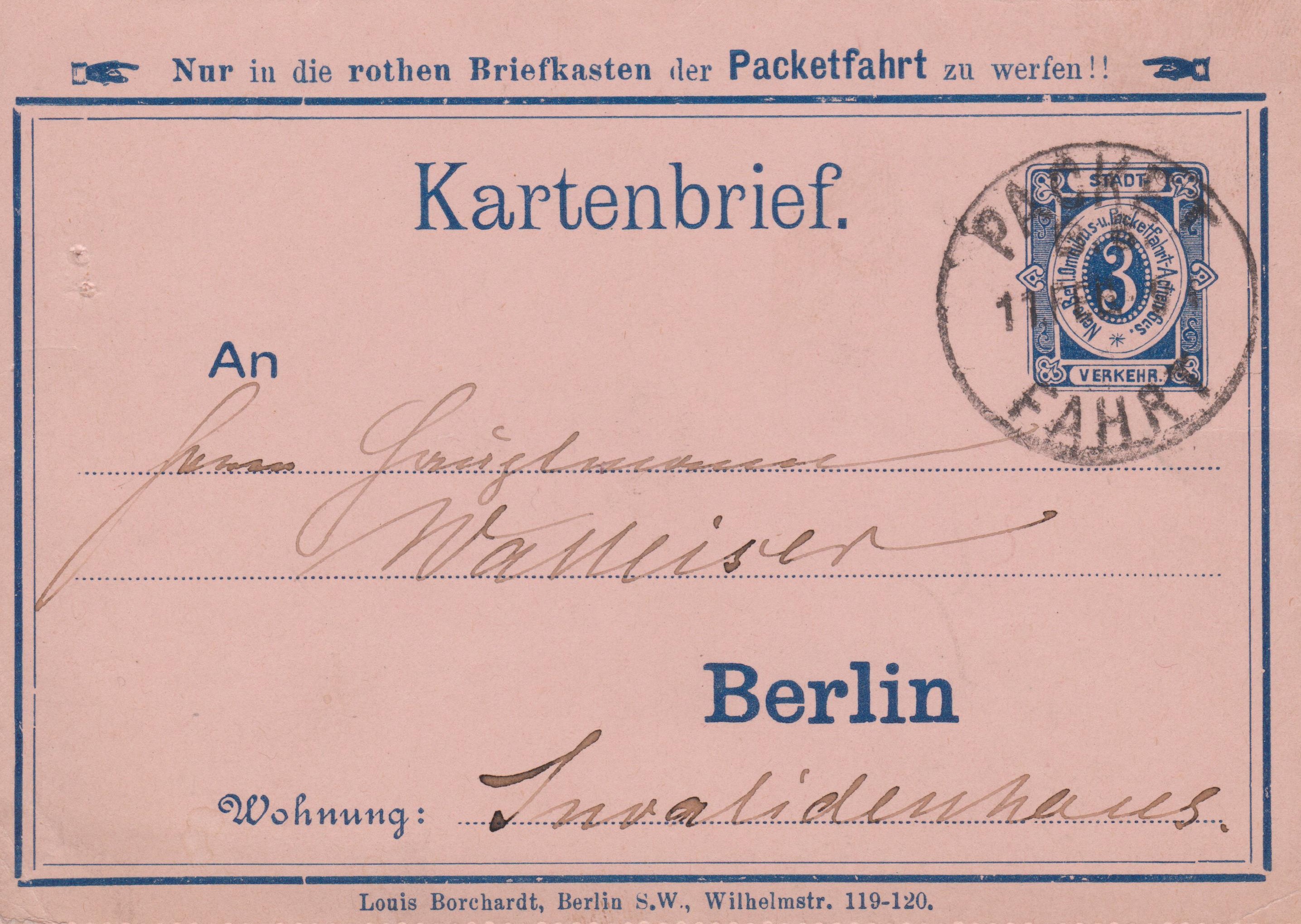 Ganzsachenvordruck "Kartenbrief" der "Packetfahrt" mit Wertzeicheneindruck 3 Pf, dem Ortstarif für Post innerhalb von Berlin entsprechend, echt gelaufen mit Aufgabestempel "PACKET FAHRT":
