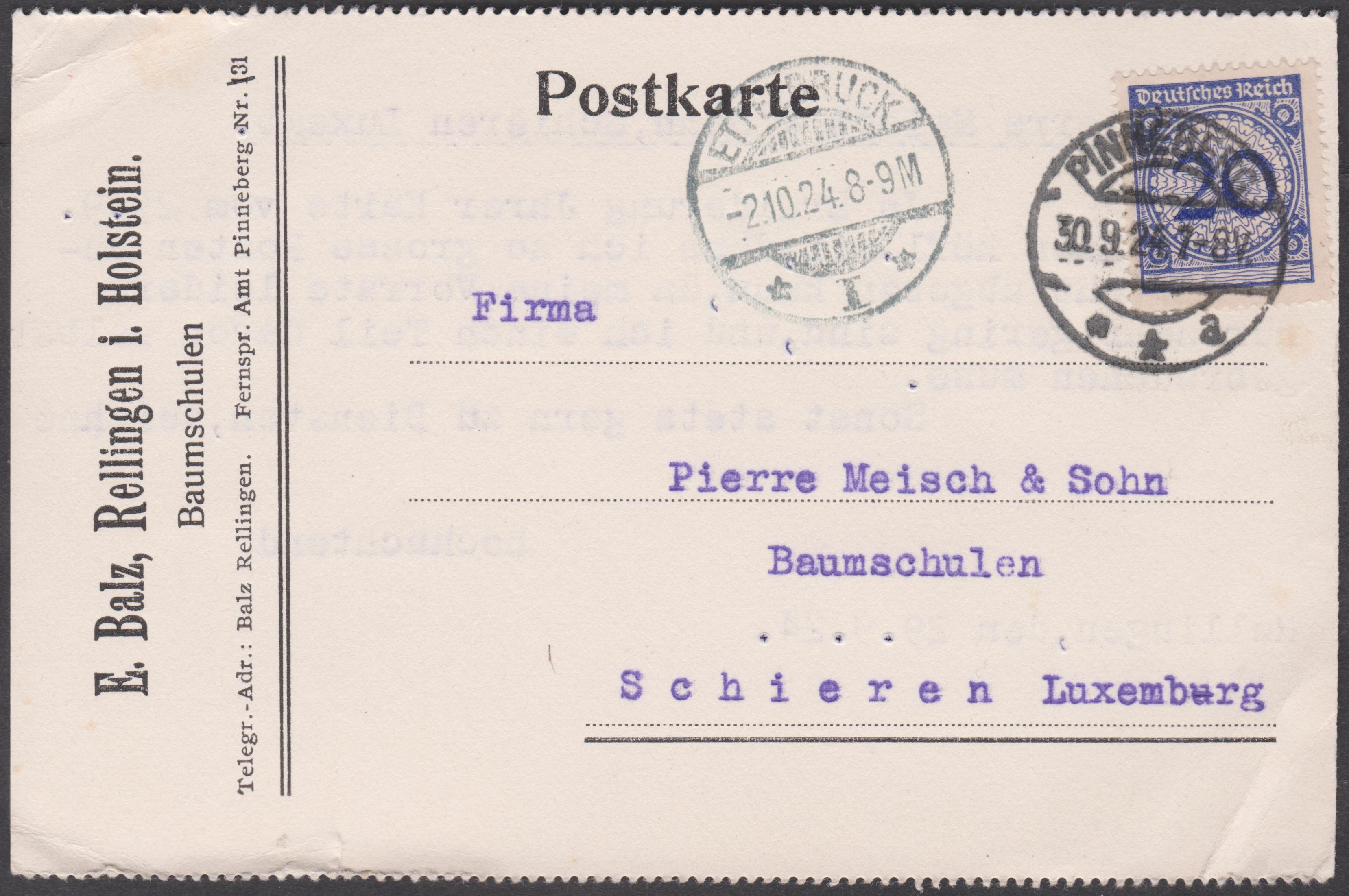 Hier eine Postkarte mit einer Einzelfranktur 20 Pf Korbdeckel, Deutsches Reich MiNr. 341, aufgegeben am 30.09.1924 in PINNEBERG, adressiert nach "Schlieren Luxemburg" mit Ankunftstempel ETTENBRUCK vom 02.10.1924: