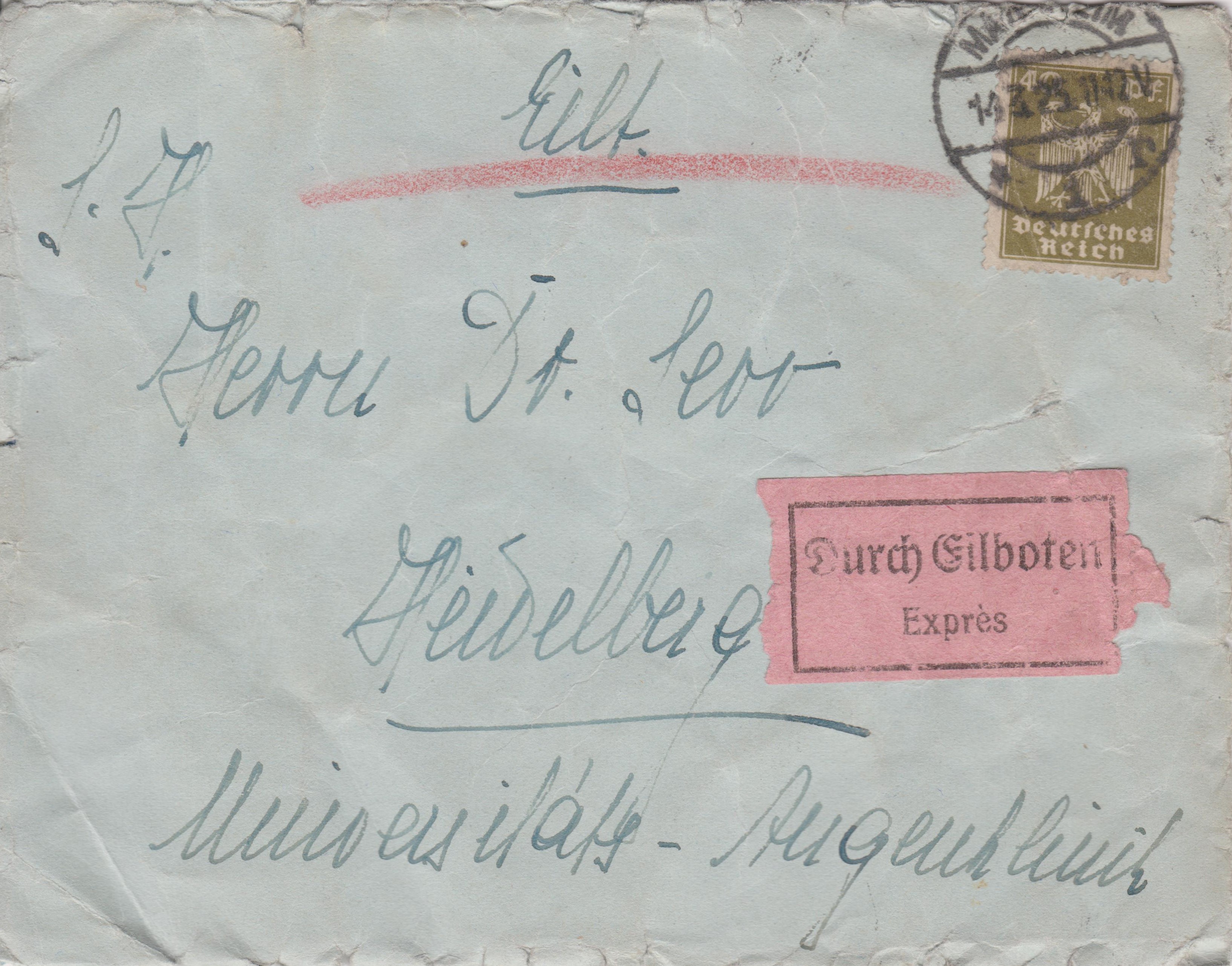 Einzelfrankatur der Wertstufe 40 Pf am 14.03.1925 auf Brief, Porto 10 Pf, "Durch Eiboten", Porto 30 Pf, von MANNHEIM nach Heidelberg, den dort der Eilbote "13" dem Empfänger zustellte: