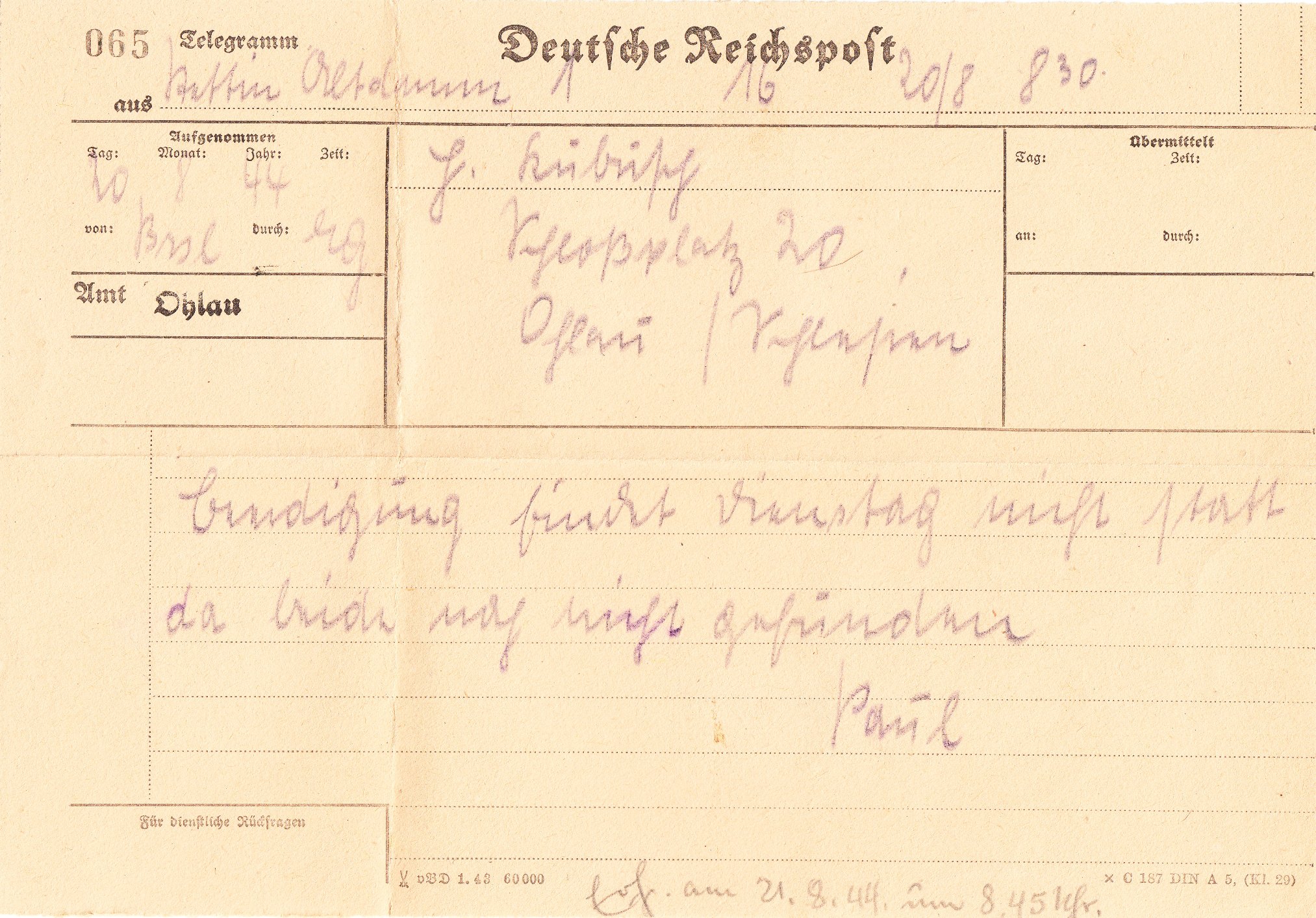 Hier als erstes Beispiel ein in Meißen im Januar 1943 in einer Auflage von 60.000 Stück gedrucktes Formular, das in diesem Falle am 20.08.1944 in Ohlau verwendet wurde: