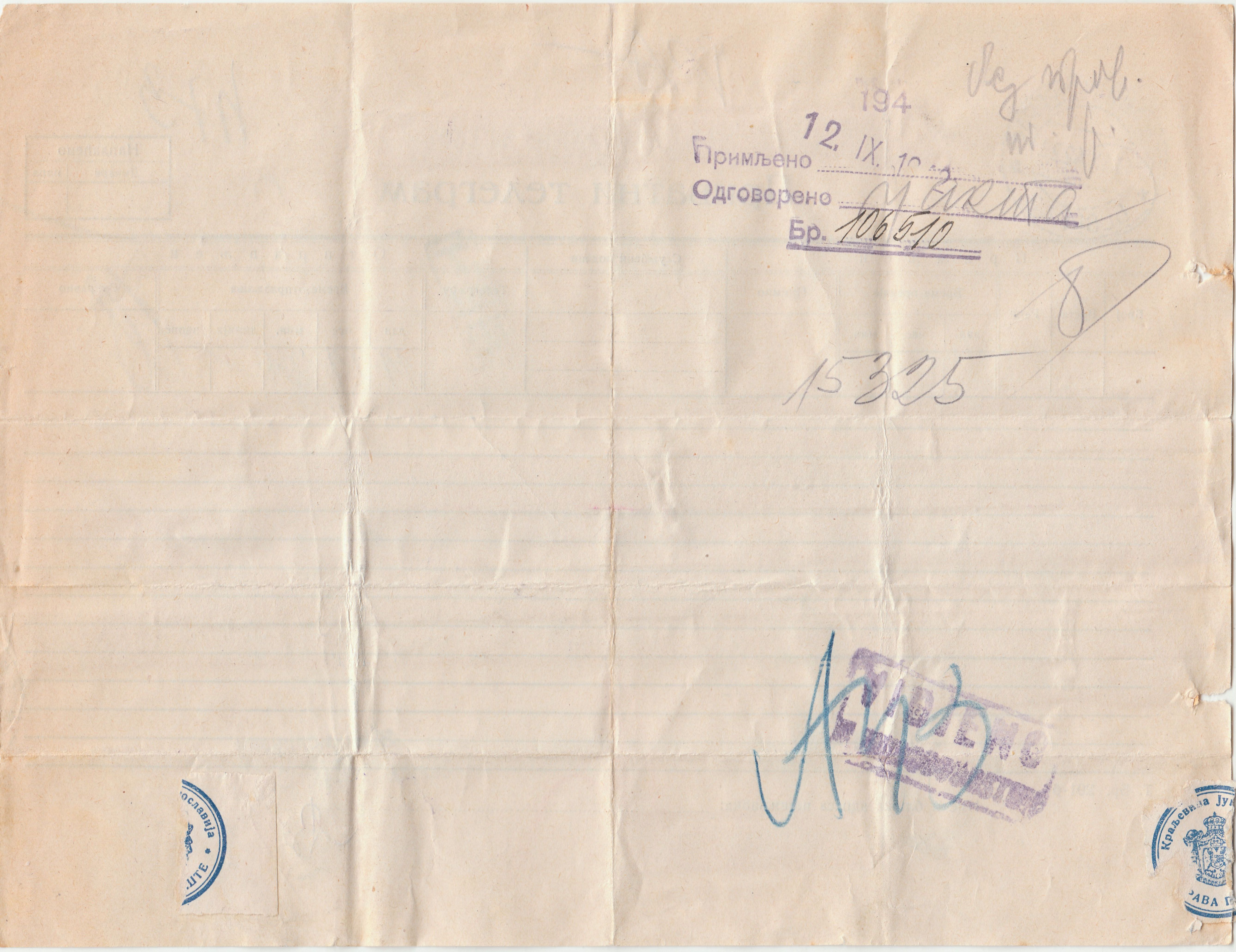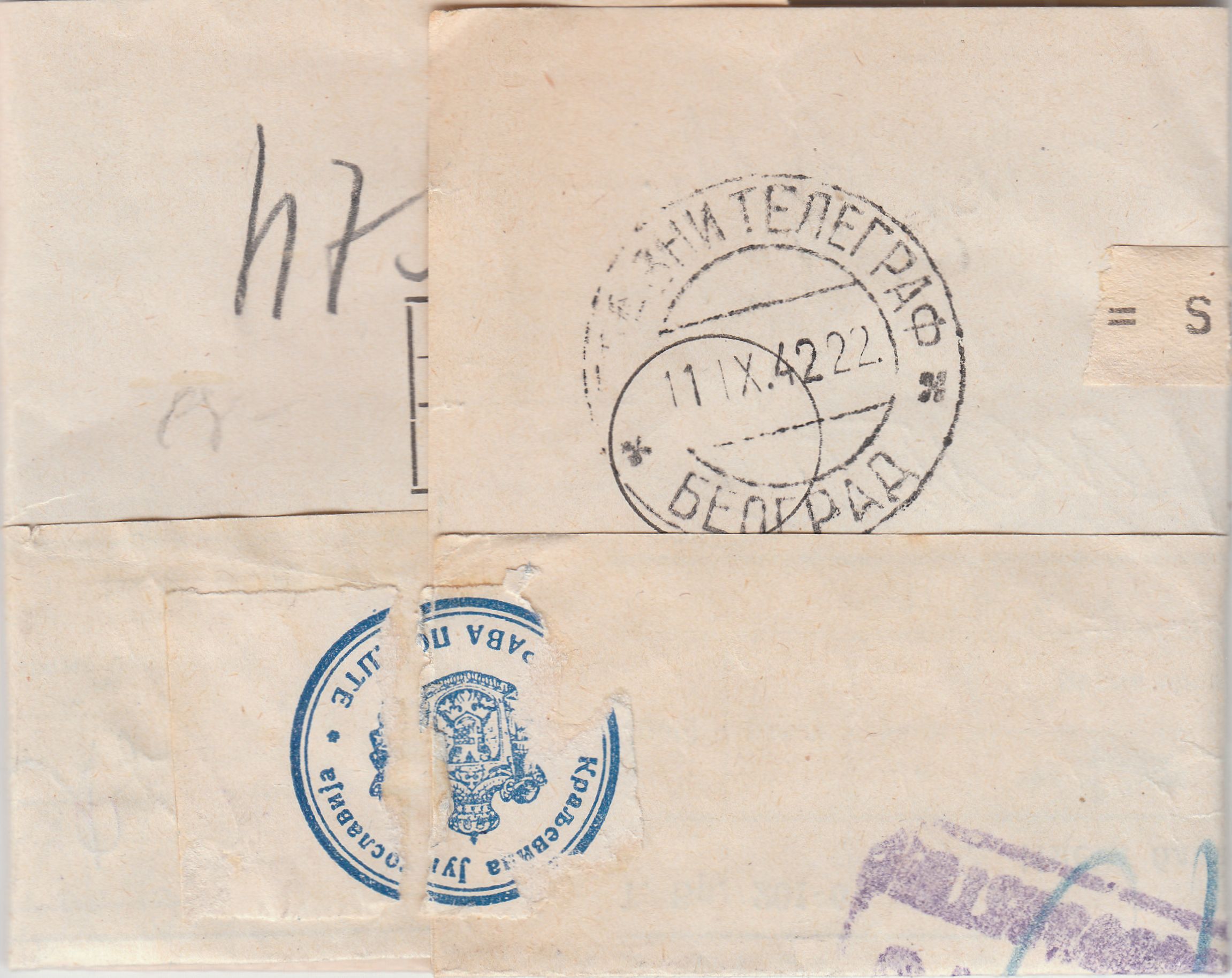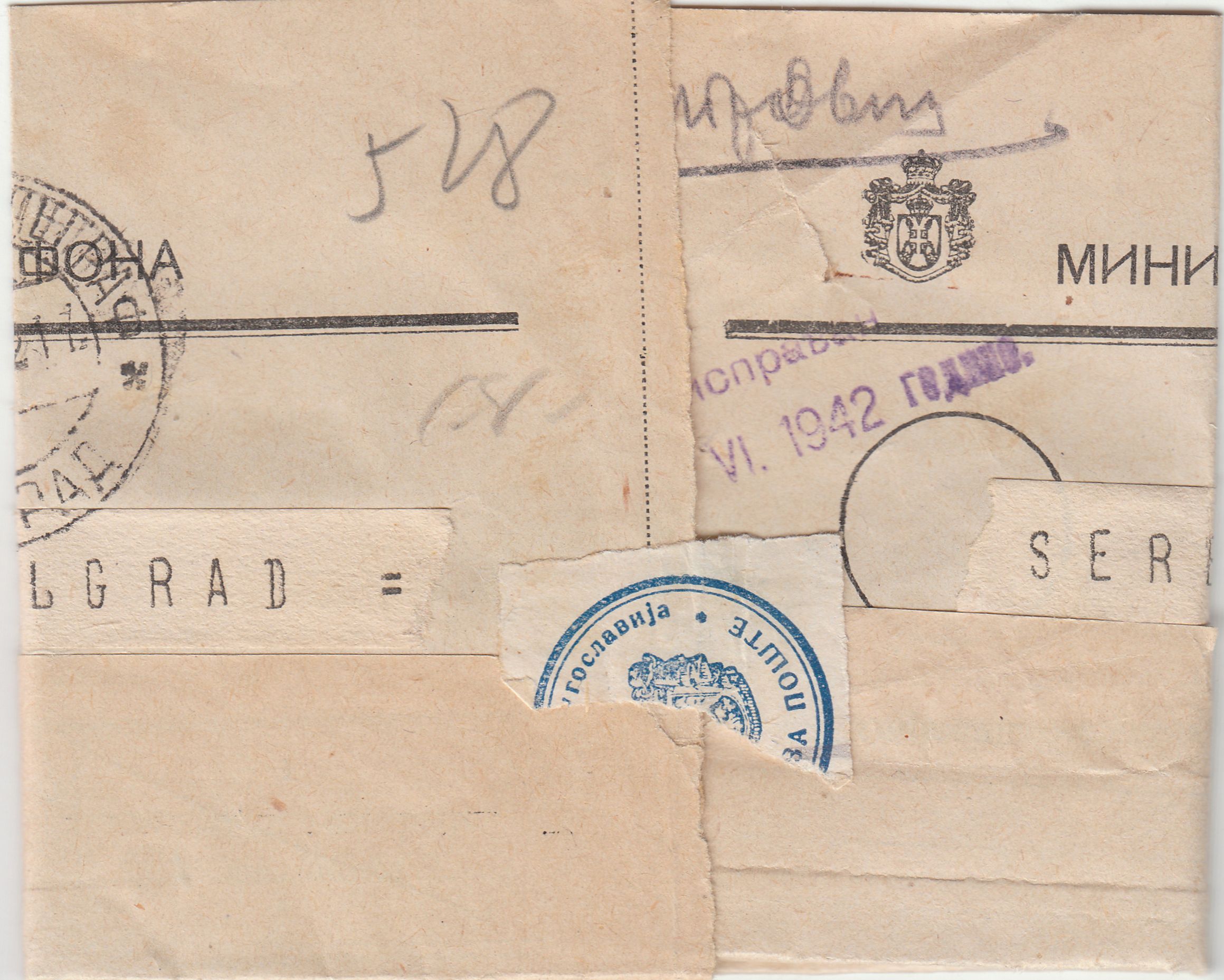 Telegramm, in Belgrad angekommen am 11.09.1942, also während der Zeit, als Serbien unter deutscher Militärverwaltung stand: