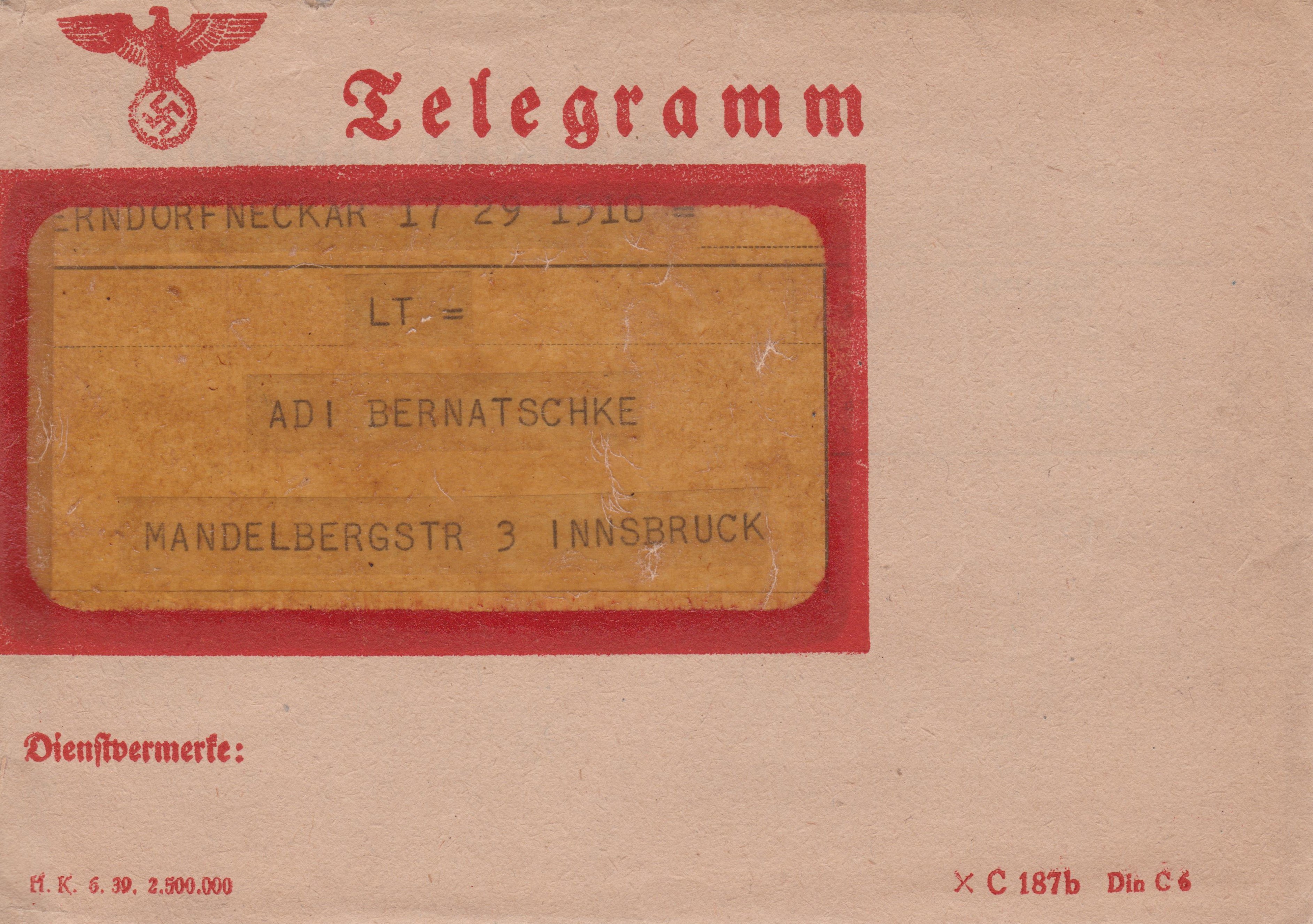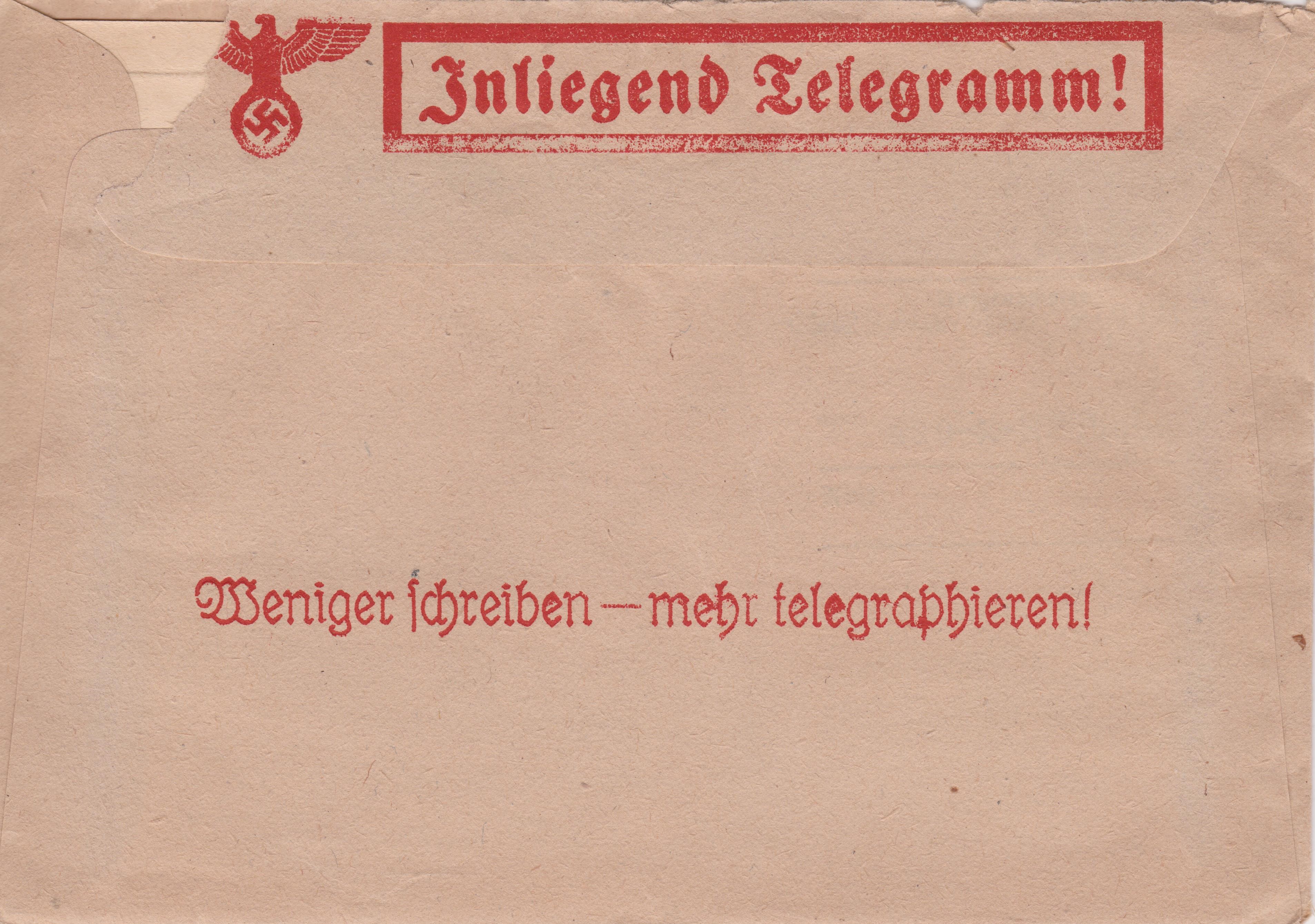 Telegramm "Deutsche Reichspost" vom 19.11.1940 aus OBERNDORFNECKAR nach INNSBRUCK mit Unschlag mit rückseitiger Posteigenwerbung "Weniger schreiben - mehr telegraphieren":