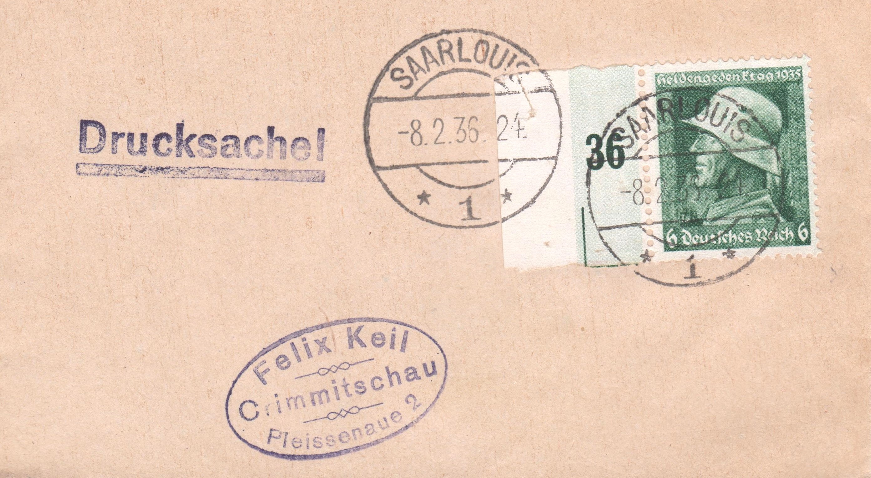 Die Bogenränder links zeigen zum ersten Mal seit dem Bestehen der Reichsdruckerei (und preußischen Staatsdruckerei) Summierungszahlen, hier die "36":