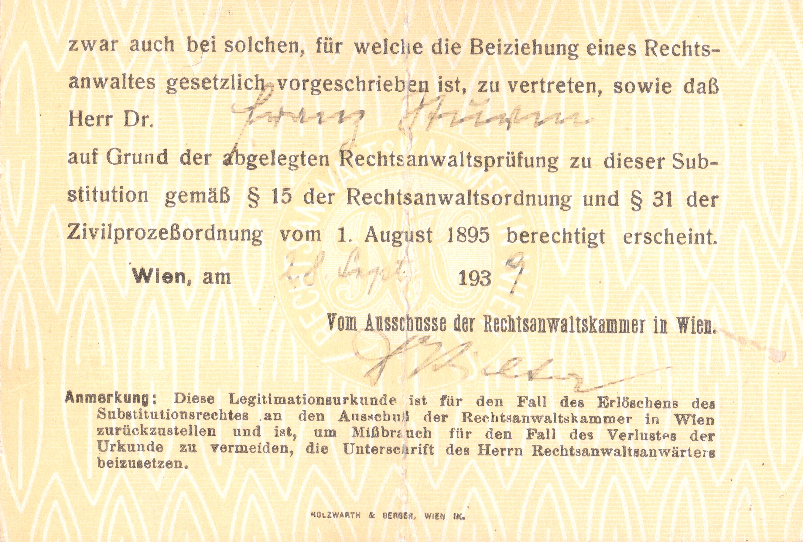 Legitimationsurkunde mit einer Gerichtskoatenmarke von 1939 zu 1 RM: