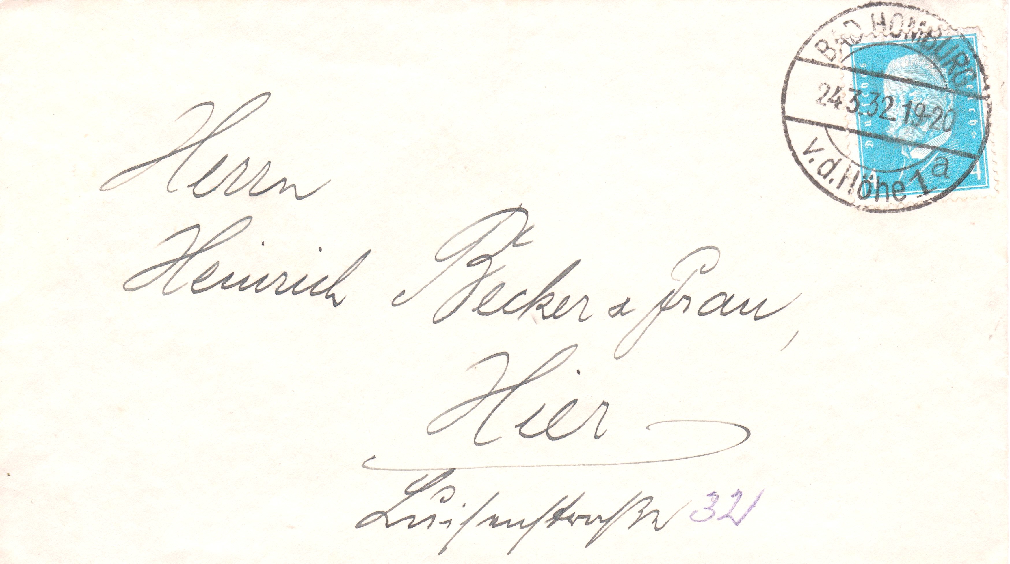 Dieses Sendung wurde am 24.03.1932 aufgegeben im Ortsverkehr von BAD HOMBURG v. d. Höhe: