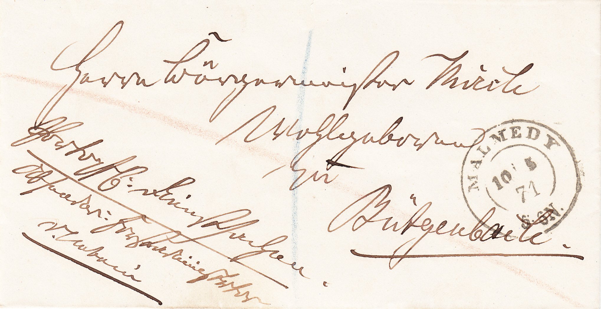 Aus dieser Übergangszeit stammt dieser nach Bütgenbach adressierte Brief, der am 10.05.1871 in Malmedy aufgegeben wurde und als "Portopfl. Dienstsachen" zu einem Porto von 1 Groschen befördert wurde: