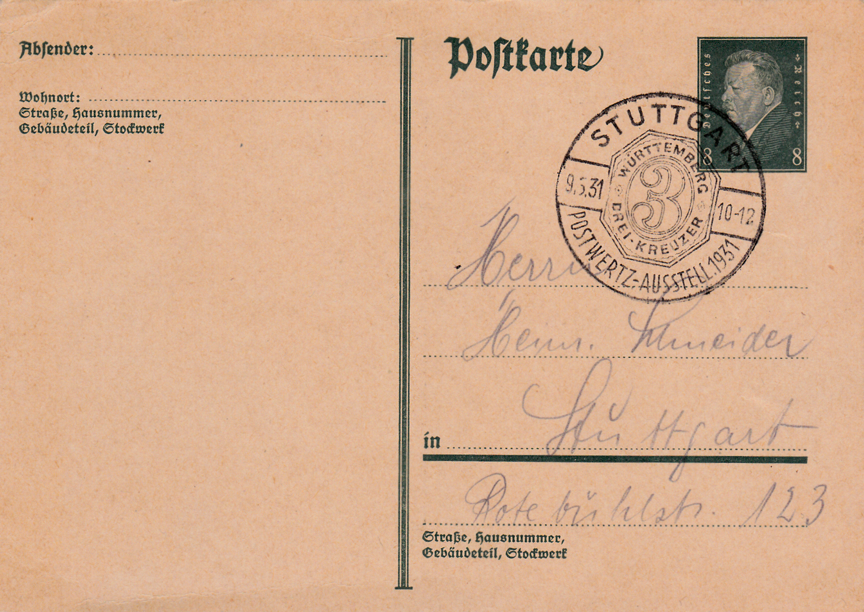 Es gibt auch Ganzsachen als Postkarten mit Wertstempel aus "Reichspräsodenten". Hier zeige ich eine gelaufene Postkarte mit dem Wertstempel zu 8Pf "Friedrich Ebert" (MiNr P 181 I).