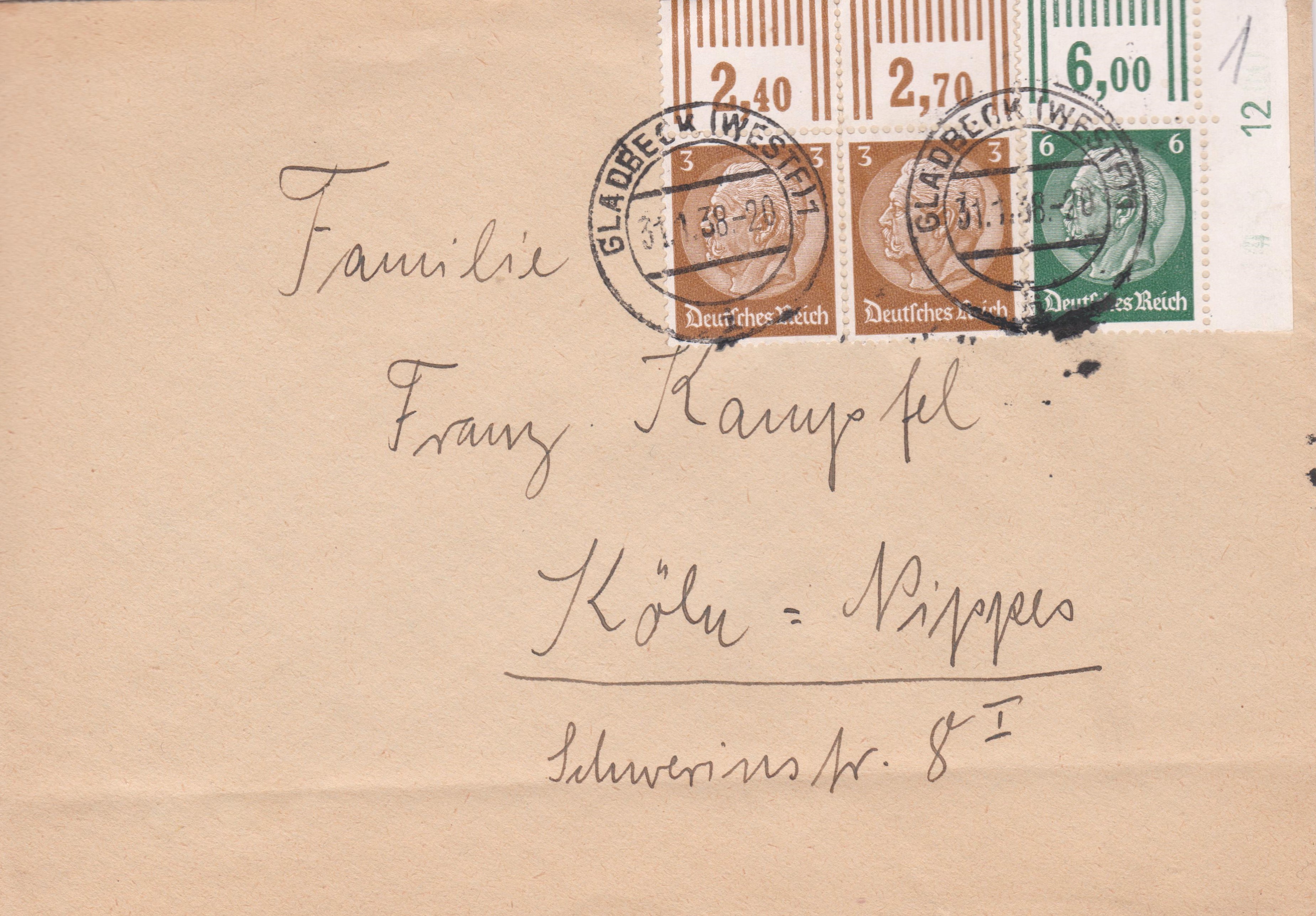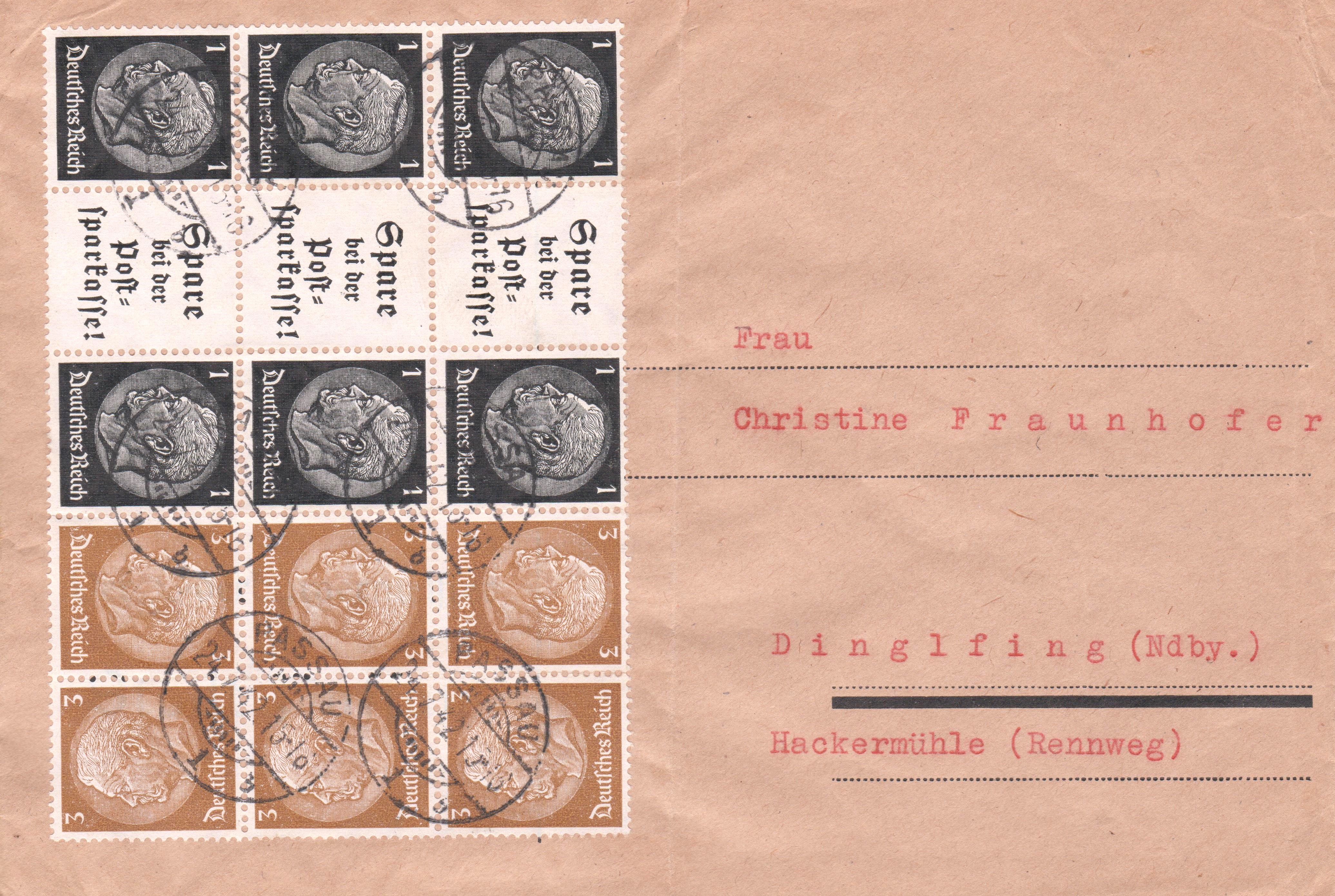 Brief im Fernverkehr, Portostufe 12 Pf, portorichtig freigemacht per Mischfrankatur mit einem Paar der Wertstufe 3 Pf der Dauerserie Hindenburg-Medaillon vom Oberrand sowie einem Eckrandstück der Wertstufe 6 Pf der Dauerserie Hindenburg-Medaillon mit Klischeenummer "12" im Seitenrand: