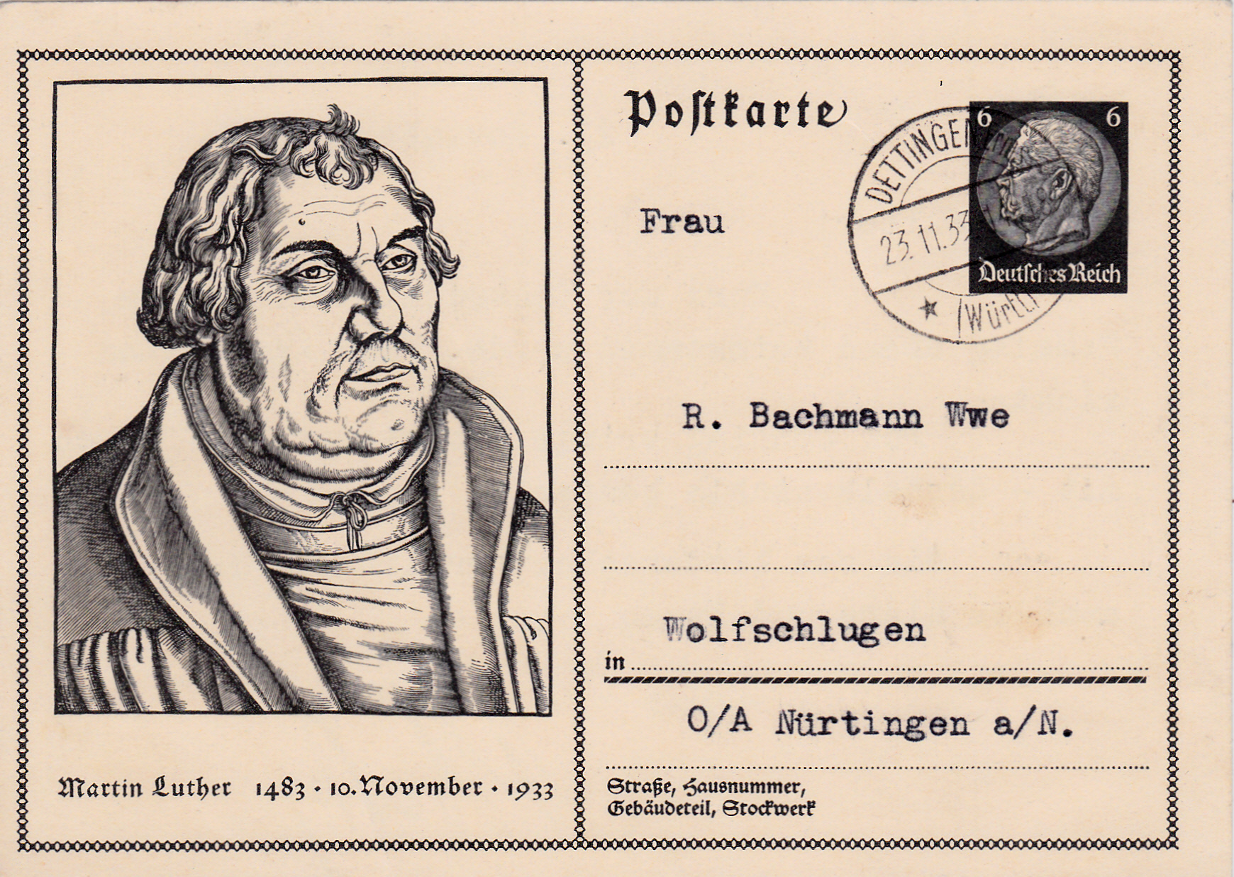 Zum 450. Geburtstag von Dr. Martin Luther erschien am 04.11.1933 eine Gedenkpostkarte im Deutschen Reich (MiNr P 224).