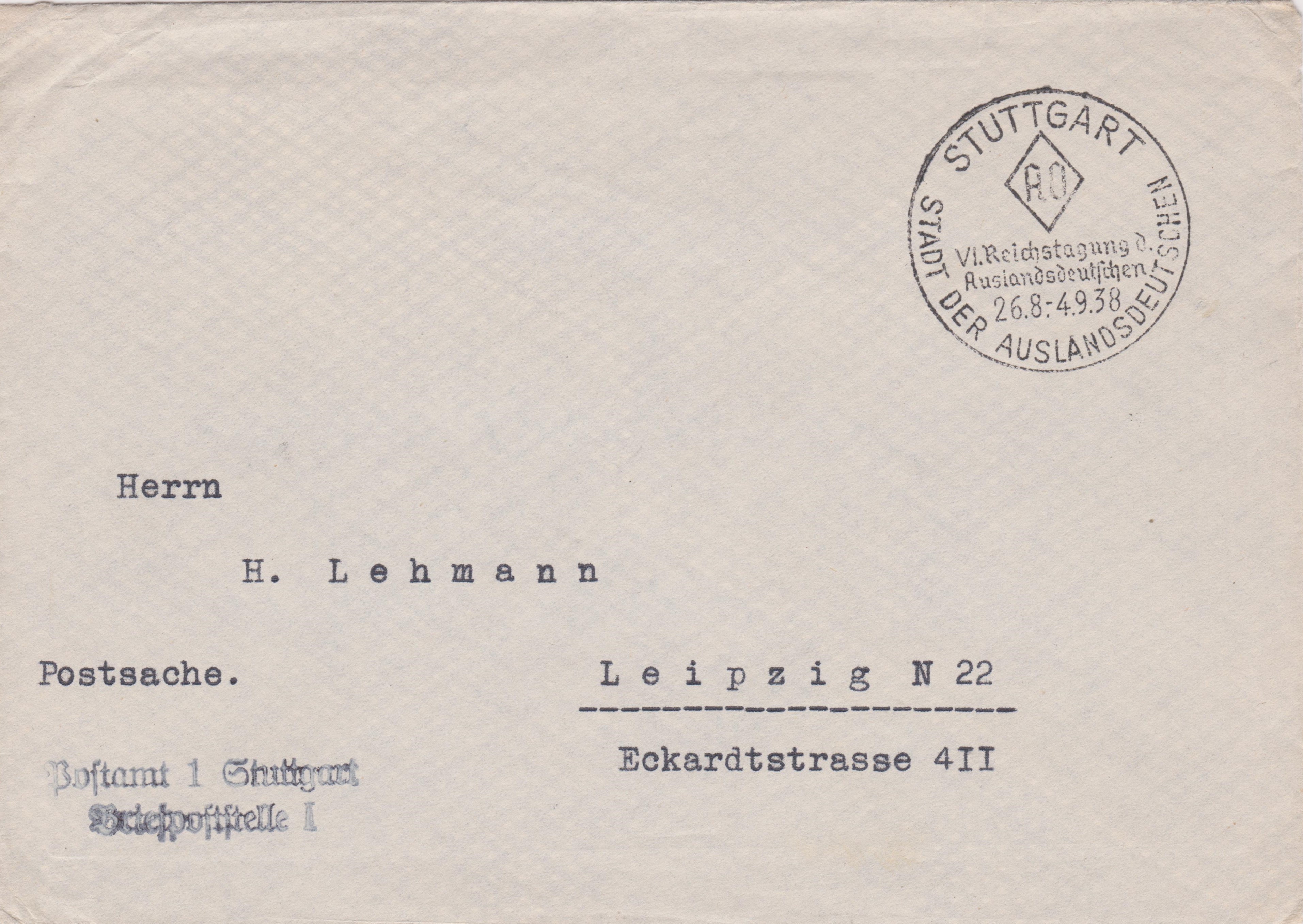 Zunächst der Originalstempel mit dem Zusatz "STADT DER AUSLANDSDEUTSCHEN", dieser Abschlag ist vom 11.05.1938: