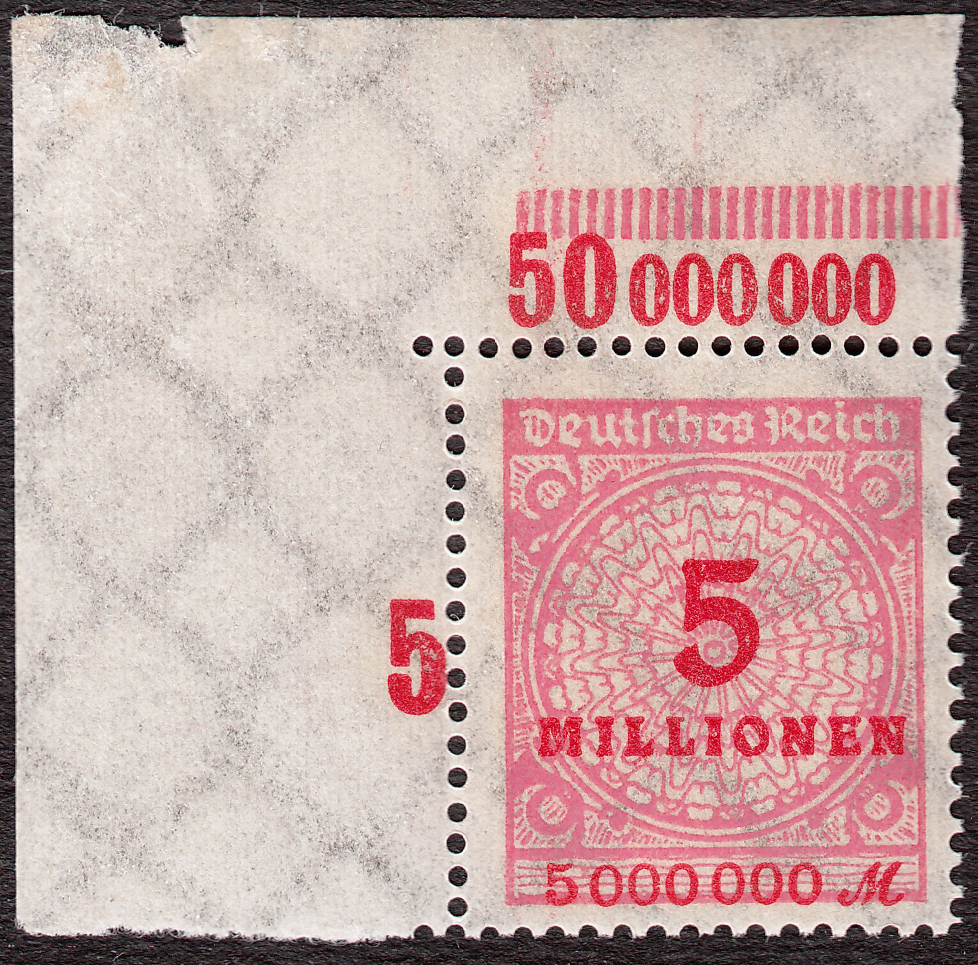 Philatelistisch interessant ist der Plattenfehler "Sprung im Korbdeckel" bei dem Wert zu 1 Million Mark, katalogisiert als MiNr. 314 A P HT: