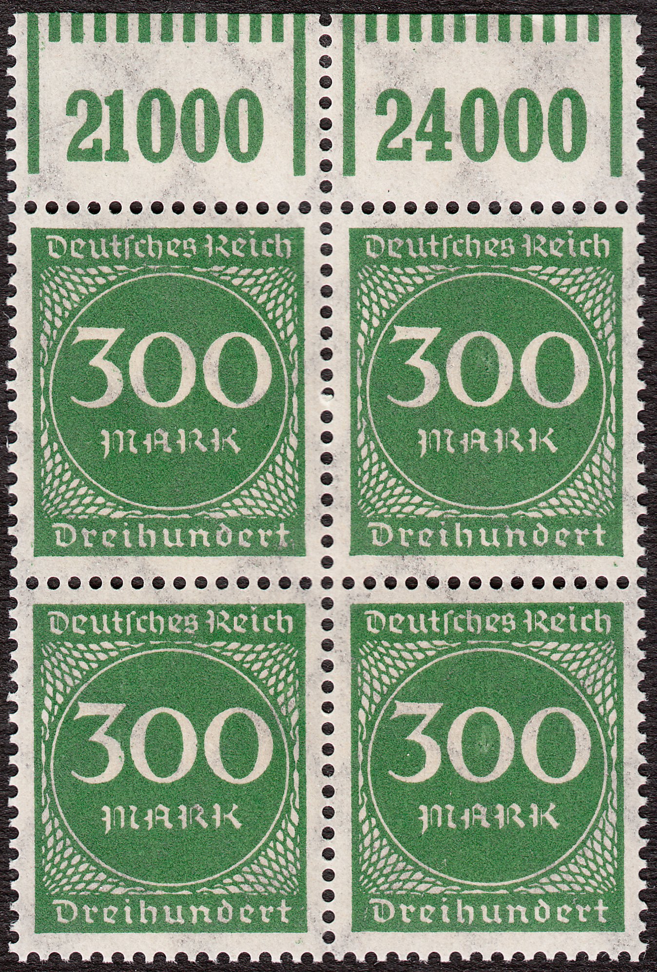 Aus der Anfangszeit der Inflation 1923 stammt die MiNr. 270 mit dem Nennwert 300 Mark, hier als Viererblock vom Oberrand MiNr. 270 W OR 1'11'1: