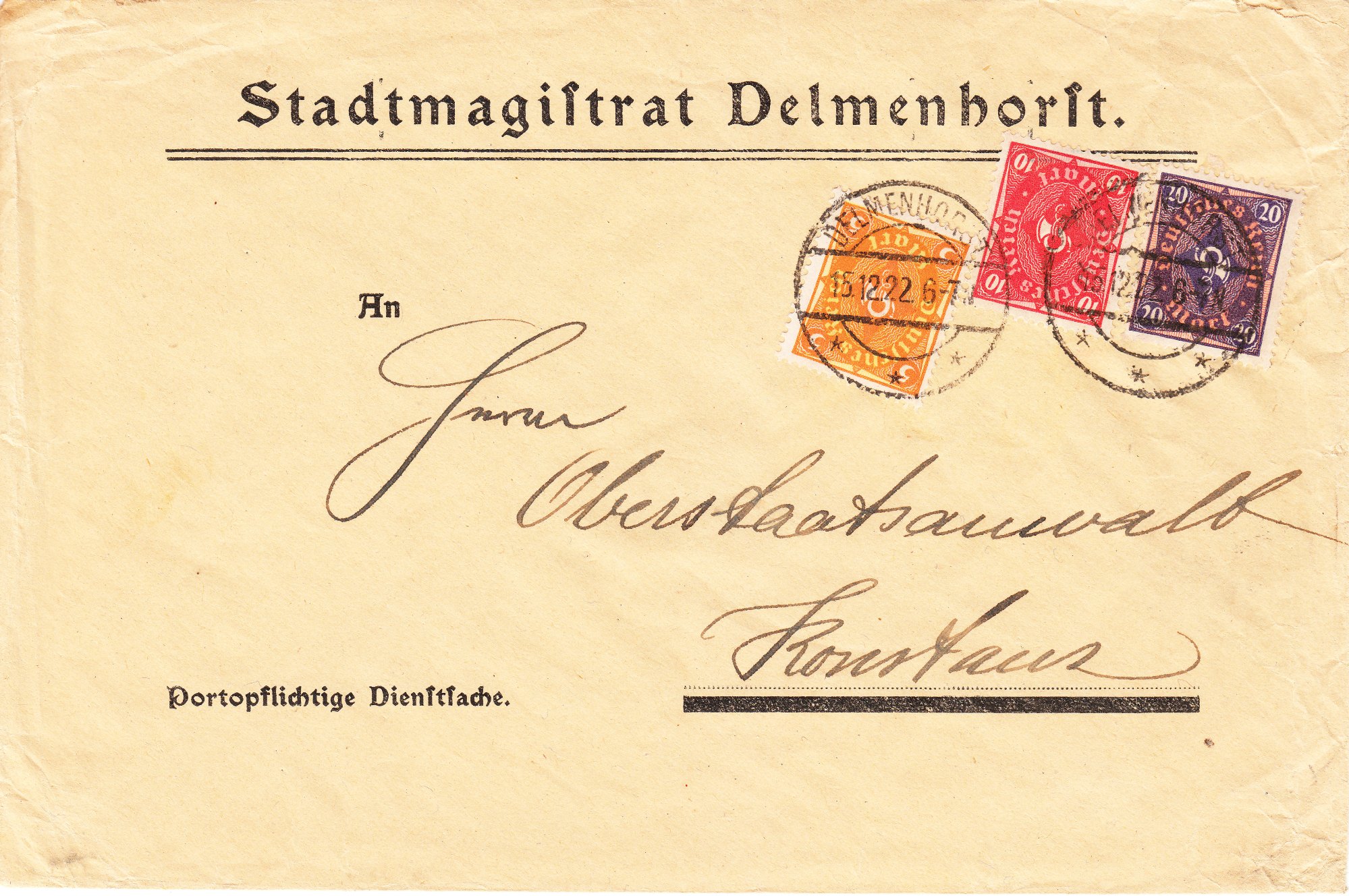 35 Mark betrug das Porto für einen Fernbrief der zweiten Gewichtsstufe von 21 bis 100 g vom 15.12.1922 bis zum 14.01.1923, hier als Beleg vom 15.12.1922 als Ersttag dieser Portostufe mit einer MiF der MiNr. 205/206/207: