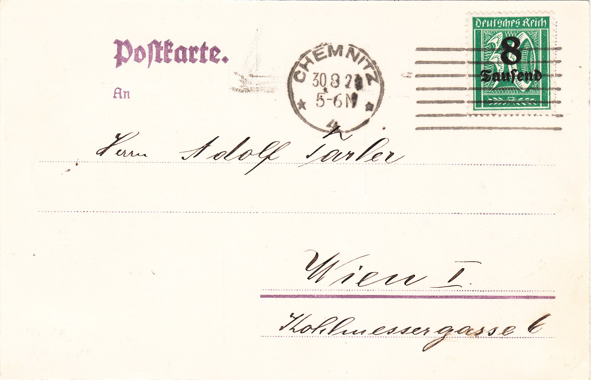 Während der kurzen Zeitspanne vom 24.08.1923 bis zum 31.08.1923, also ganze 8 Tage lang, galt für eine Postkarte im Fernverkehr die hier am 30.08.1923 auf einer Postkarte von Chemnitz nach Wien als Einzelfrankatur mit einer MiNr. 278 X dargestellte Portostufe von 8 Tausend Mark: