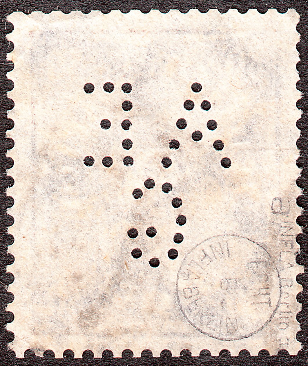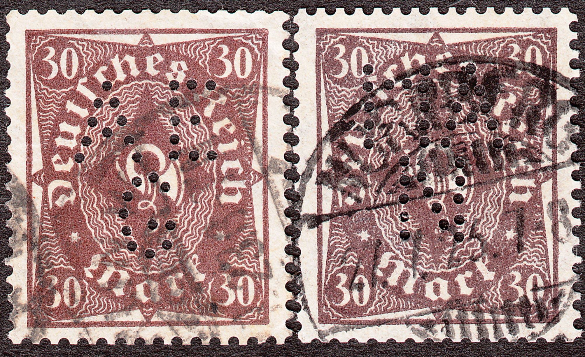 Die Marke in der Farbe "b" zeigt eine Firmenlochung "MAN" = Maschinenfabrik Augsburg-Nürnberg und wurde dementsprechend in NÜRNBERG gestempelt.
