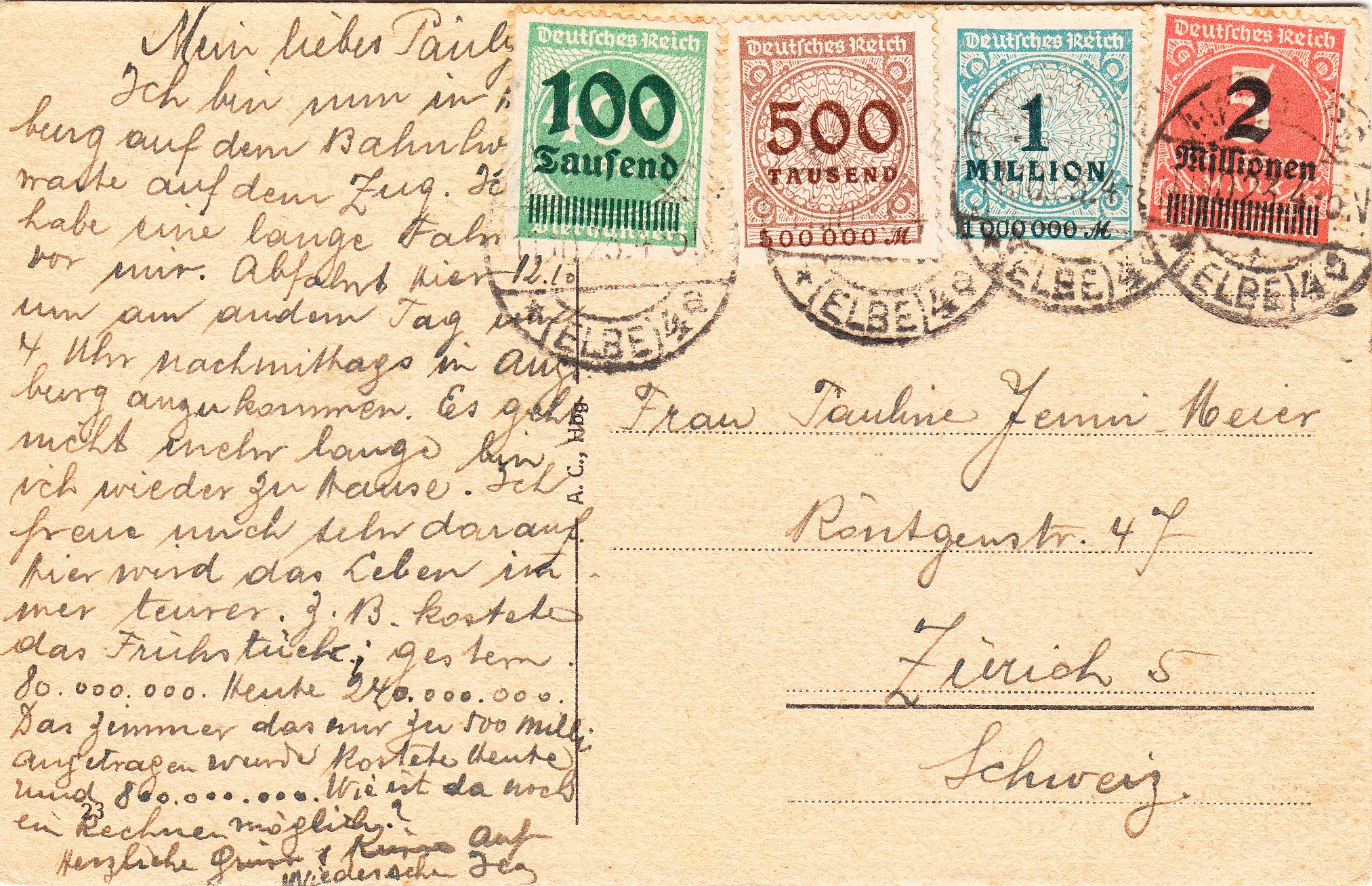 Wen wundert es, denn der Absender teilt mit, dass das Frühstück ihn am 10.10.1923 stolze 80 Millionen Mark, am 11.10.1923 hingegen bereits 240 Millionen Mark kostete.