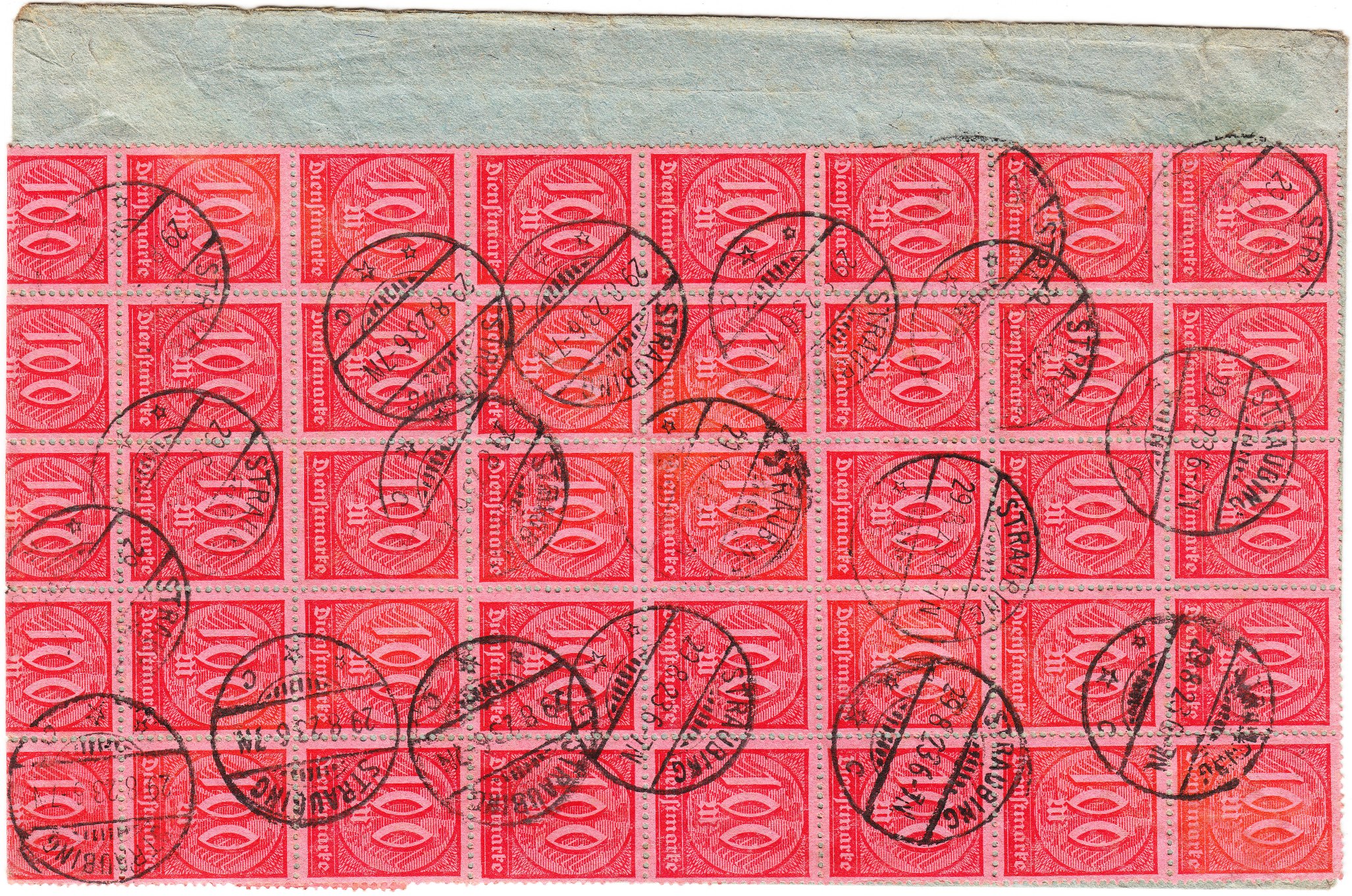 Dieser "An die Oberfinanzkasse in München" adressierte Brief trägt einen Absenderstempel "Zollamt Straubing" und ist frankiert mit einem Fünfzigerblock der DR Dienst MiNr. 74, der am 29.08.1923 gestempelt wurde: