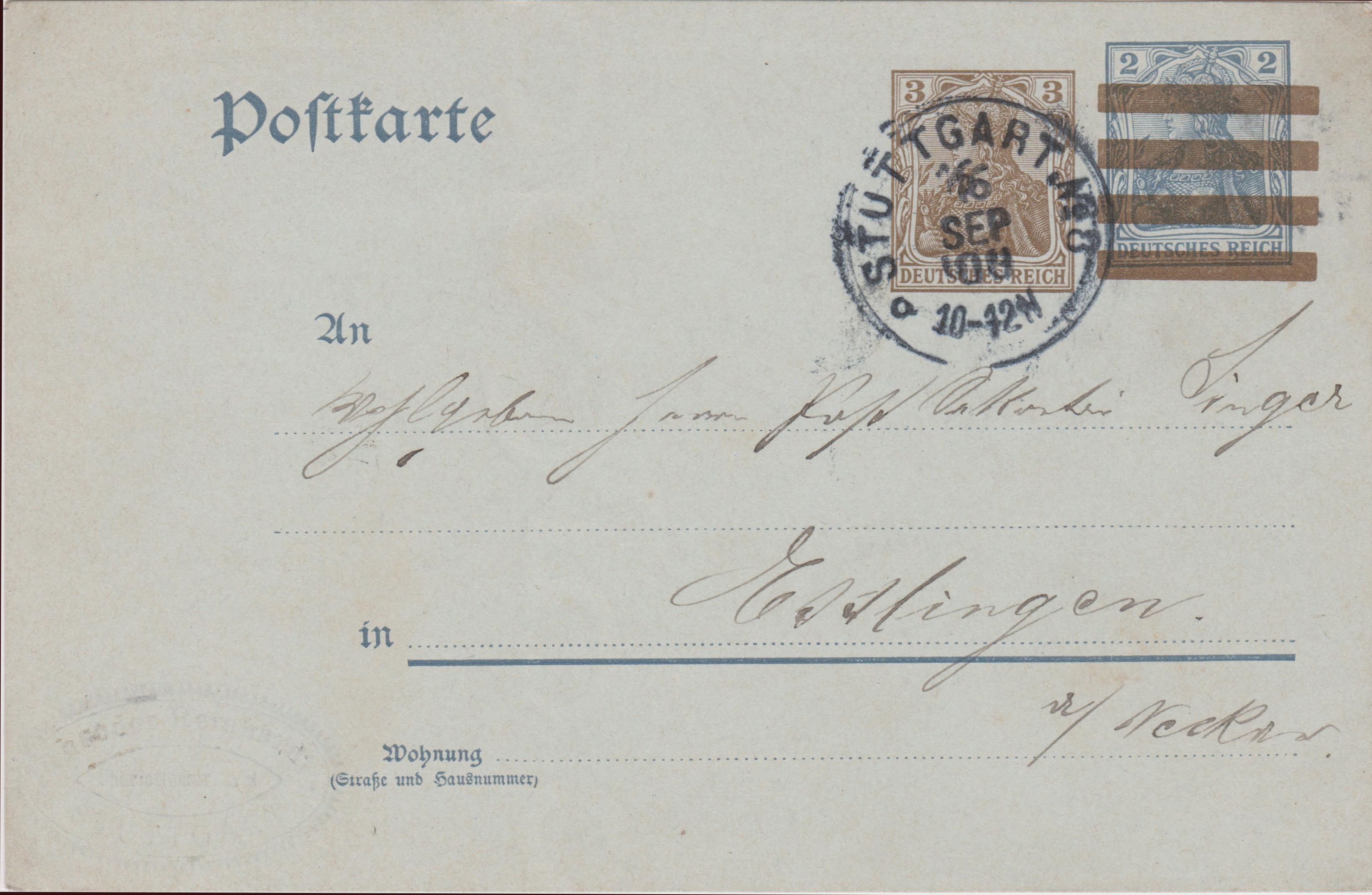 Aber aufgepasst, denn diese Postkarte lief nicht etwa im Ortsverkehr von Stuttgart, sondern ist adressiert nach "Esslingen a/ Neckar"!