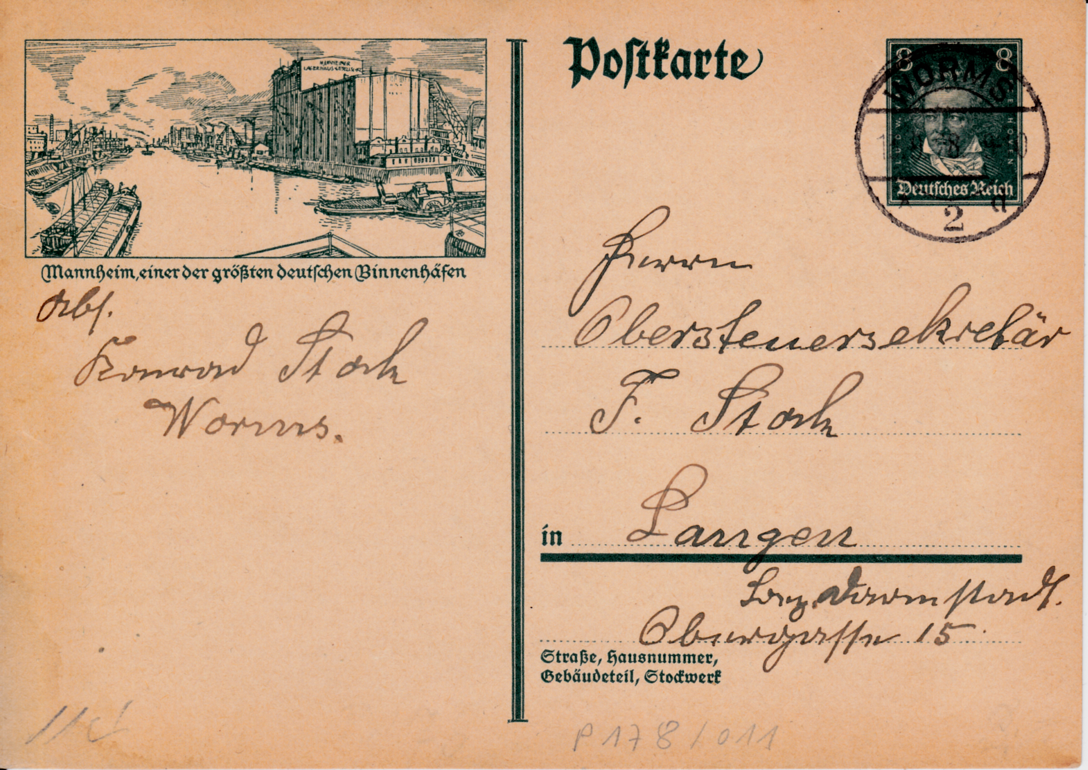 Auf dieser Bildpostkarte (MiNr P 178/11) sehen wir eine Ansicht aus dem Binnenhafen in Mannheim.