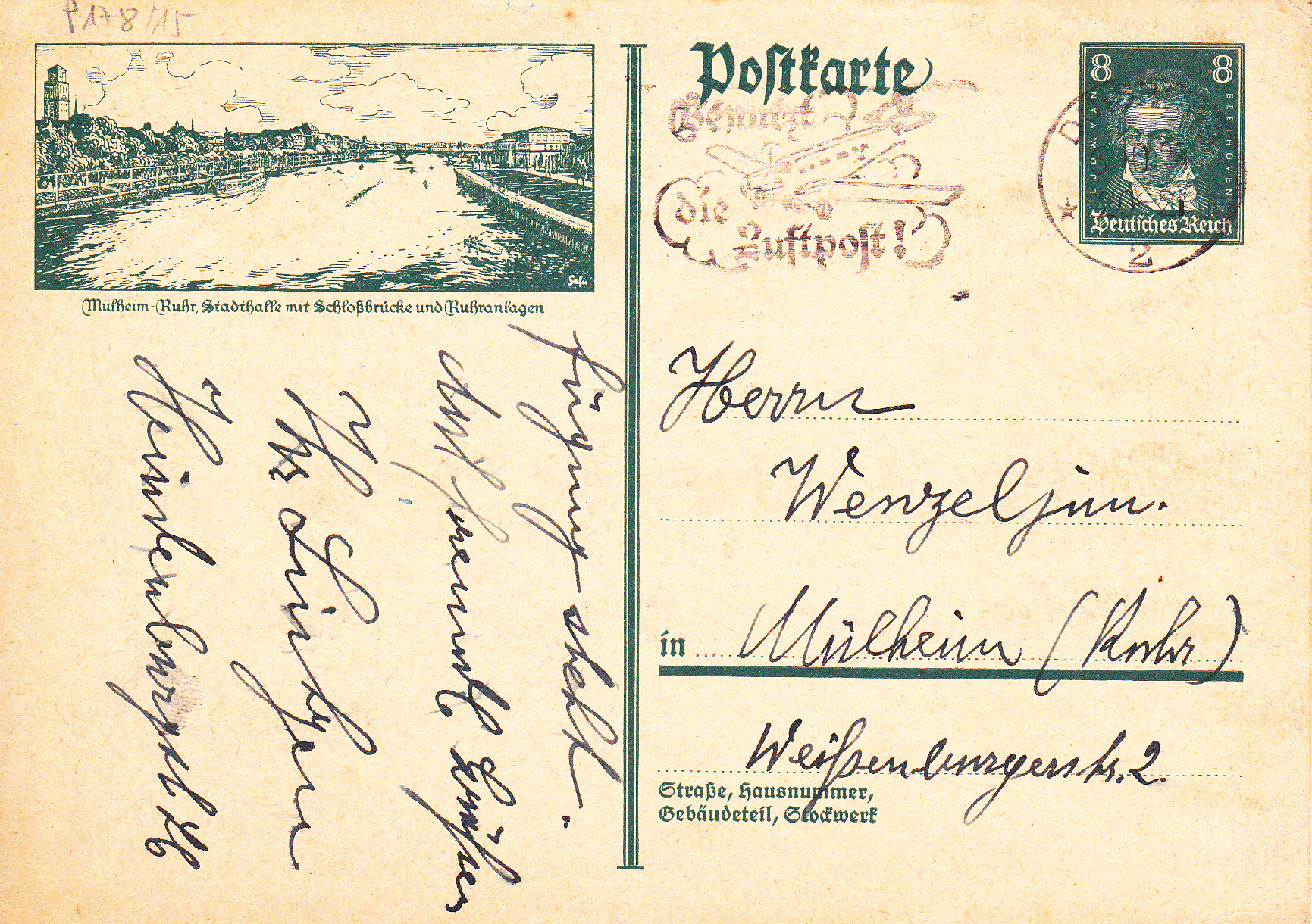 Es folgt die Bildpostkarte mit der MiNr P 178/15 mit der Abbildung der Stadthalle mit Schloßbrücke und Ruhranlagen in Mühlheim an der Ruhr.